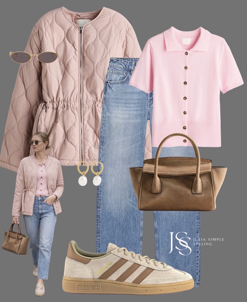 Этот образ построен на мягких пастельных оттенках, которые всегда выглядят женственно и легко. Пудровая стёганая куртка создаёт аккуратный силуэт и добавляет образу лёгкости. Благодаря кулиске на талии она формирует более стройную линию фигуры.
