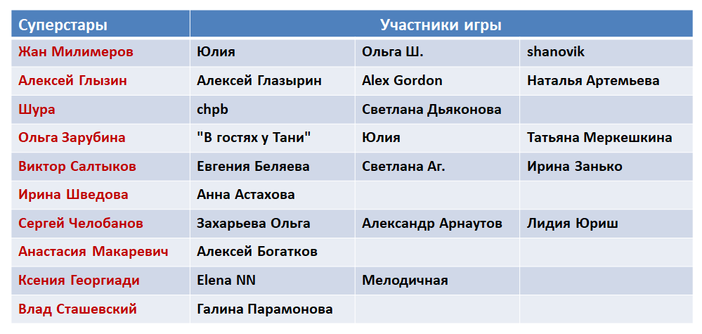 Играют с нами многие читатели, но только самых первых я занесла в таблицу: