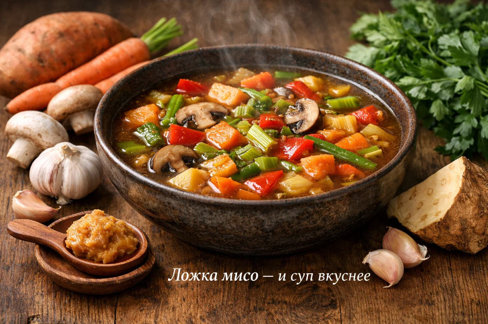 Многие думают, что мисо сделает суп «японским» на вкус. Это заблуждение. В небольшом количестве мисо-паста не навязывает блюду азиатский характер. Она просто добавляет ту самую недостающую глубину, которой так не хватает овощному супу. Вы не будете чувствовать вкус мисо как отдельный компонент — вы просто заметите, что суп стал вкуснее, и не сразу поймёте почему.