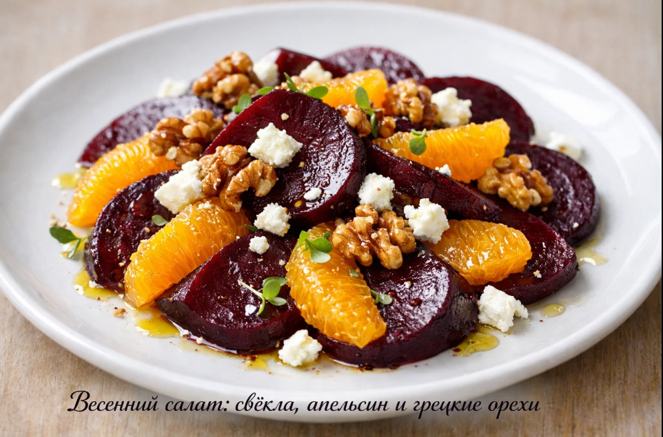 Когда за окном наконец тает снег и первые лучи настоящего тёплого солнца пробиваются сквозь облака, хочется чего-то свежего и на столе тоже. Зимой мы привыкаем к тяжёлым блюдам, густым супам, жирным подливам и бесконечной картошке. А потом приходит март, и организм буквально кричит: дай мне витаминов, дай мне цвета, дай мне чего-то лёгкого. Именно в такие моменты на помощь приходит простой, но невероятно удачный по сочетанию вкусов свекольный салат с апельсином и грецкими орехами. Блюдо, которое я открыла для себя совершенно случайно, а теперь готовлю чуть ли не каждую неделю с конца февраля и до самого лета.