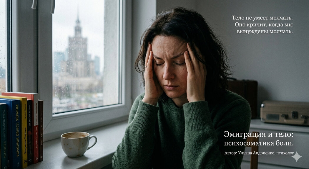 Когда тело говорит «нет»: Психосоматика вынужденной эмиграции и как вернуть себе опору Вы можете убедить себя, что «уже адаптировались» и «всё в порядке». Вы можете перестать плакать по ночам и начать строить планы. Но ваше тело не обманешь. Каждое утро оно просыпается раньше вас — с тяжестью в груди, ноющей спиной или привычным спазмом в животе. Врачи разводят руками: анализы в норме, органических патологий нет. Это не «просто нервы». Это ваше тело взяло на себя роль главного рассказчика той боли, которую вы запретили себе проживать вслух. Почему в эмиграции «кричит» именно тело? Эмиграция (особенно вынужденная) — это не просто переезд. Это разрыв базовых опор. Мозг находится в режиме выживания 24/7, уровень кортизола зашкаливает месяцами. У женщин это проявляется острее: мы склонны «консервировать» стресс внутри, чтобы оставаться функциональными для детей и близких. Тело соматизирует — превращает невыплаканные слезы и невысказанный гнев в физические зажимы. Карта ваших симптомо