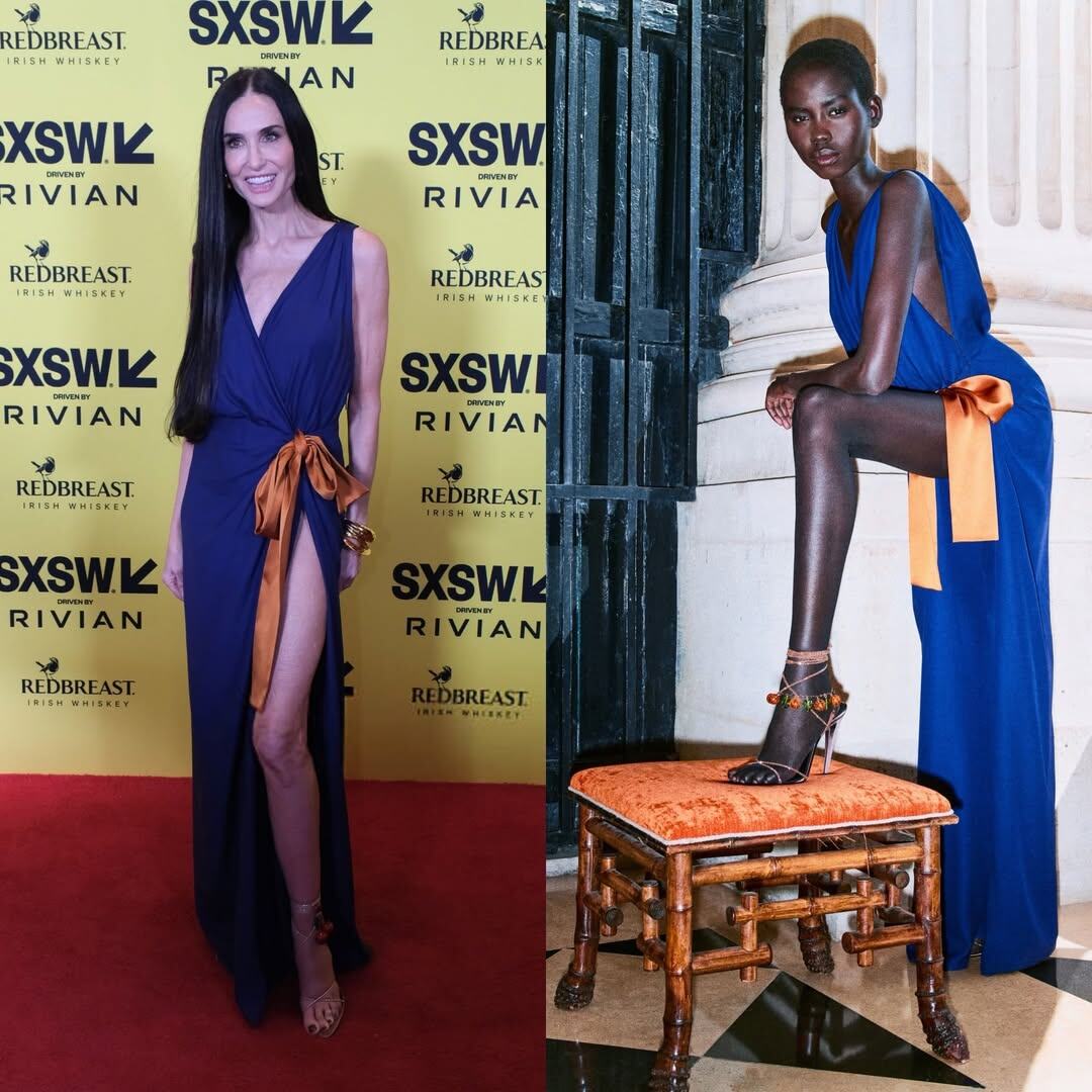 На красной дорожке фестиваля South by Southwest 63-летняя Деми Мур появилась в образе, который невозможно было не заметить. Синий шелк платья Saint Laurent струился по фигуре, создавая эффект легкости и дерзкой элегантности одновременно. Разрез до бедра и глубокое декольте добавляли драматизма, а крупный оранжевый бант на талии словно удерживал весь образ в равновесии, превращая наряд в настоящий