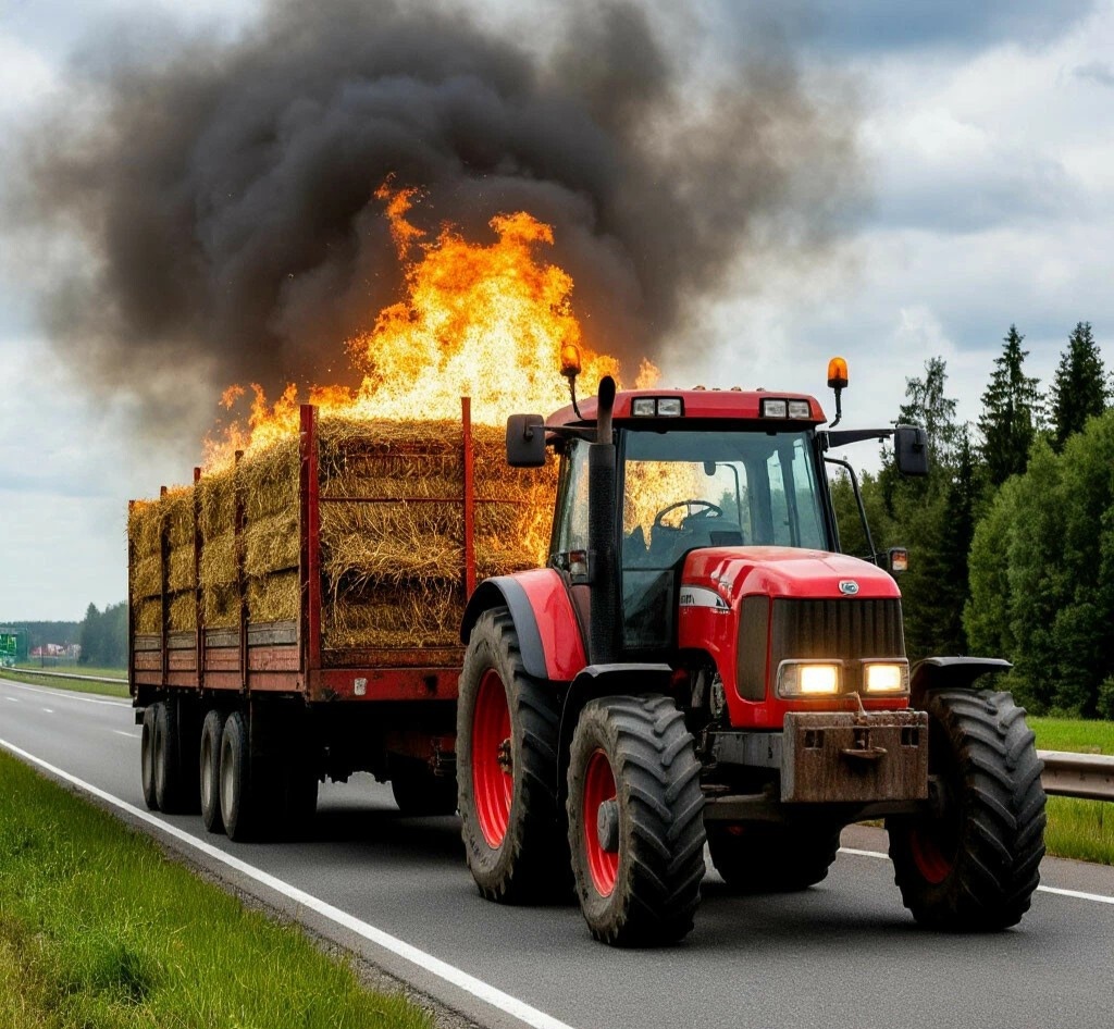 Обычный рабочий день. Я возвращался домой с обеда — точнее, я как раз ехал пообедать. Дорога привычная, трасса рядом с рекой, машин немного. И вдруг вижу: на обочине стоит трактор с телегой, доверху забитой сеном, а из телеги валит густой черный дым. Горит.