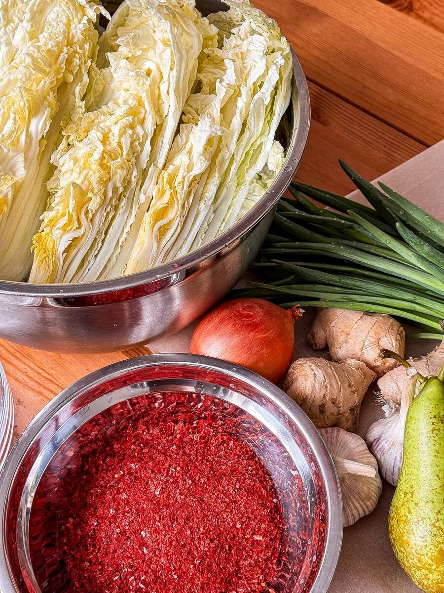 Мы уже писали пару раз, что безоговорочные фанаты кимчи. Но сейчас это вышло на новый уровень и готовим его дома и не можем остановиться. В чем магия кимчи? В его цикличности. Съел кусочек - хочется чего-то еще. Съел это "что-то еще" - снова хочется кимчи. И так до бесконечности. Это как идеальный саундтрек к любой еде. А еще нам нравится, сколько в нем деталей. Дайкон, имбирь, груша, лук, капуста и, конечно, кочукару — главный герой этой истории. Все это живет своей жизнью, ферментируется, превращается во что-то совершенно новое. Ферментация вообще отдельная магия - она и сохраняет продукт, и трансформирует его. Немного занудства. Ферментация - сложный процесс, где главные герои - лактобактерии. Вот что они делают: Поедают натуральные сахара из овощей → вырабатывают молочную кислоту → создают кислую среду, где патогенные бактерии не выживают → сохраняют продукт и трансформируют его вкус. Соль (около 3%) создает идеальную среду для лактобактерий, блокируя вредные микроорганизмы.