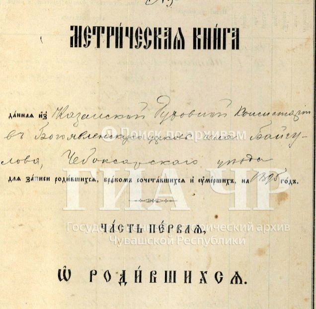 Село Байгулово. Метрическая книга о родившихся за 1885-1904 гг. ГИА Чувашской Республики (ГИА ЧР), фонд № 557, опись № 8, дело № 53, стр. 332 скан. Метрическая книга, данная из Казанской Духовной Консистории в Богоявленскую церковь села Байгулова Чебоксарского уезда, для записи родившихся, браком сочетавшихся и умерших на 1895 год. Часть первая. О родившихся. Стр. 339 скан. Февраль. № 10. 28 января родился. 2 числа крещен. Семен. Родители: Чебоксарского уезда Посадско-Сотниковской волости деревни Арзаматовой казенный из чуваш крестьянин Самуил Васильев и законная его жена Александра Петрова, оба православного вероисповедания. Восприемники: Вятской губернии города Нолинска мещанина Павла Андреева Кощеева сын Иван и Чебоксарского уезда села Тимерчи умершего крестьянина Егора Филиппова Кутаркина дочь девица Александра. Крещение совершил священник Петр Троицкий. Псаломщик Александр Троицкий. https://yandex.ru/archive/catalog/affeea90-69a5-45c7-8979-a38f3f3a2bcf/339