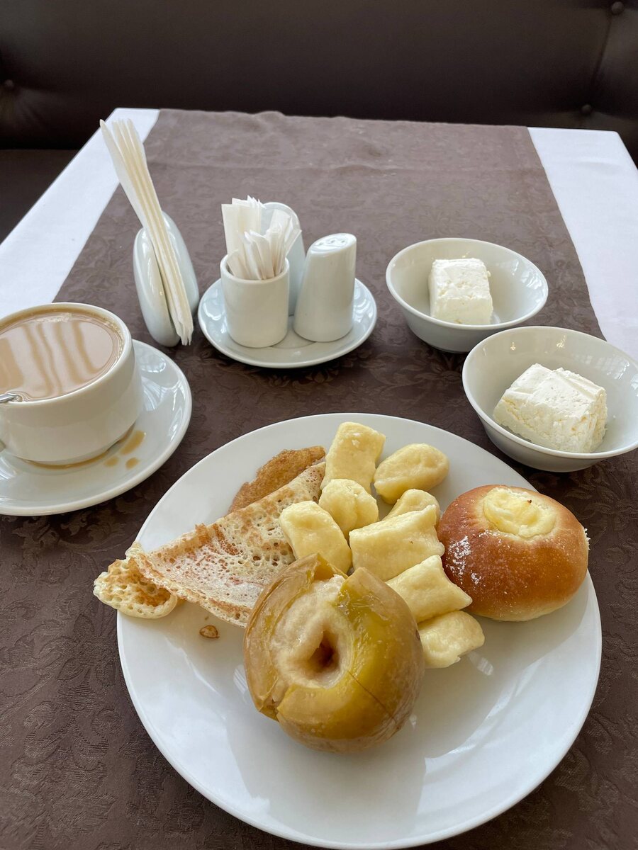Вчера: на завтрак ленивые вареники с творогом, творог, печеное яблоко, блинчик, ватрушка с творогом и кофе; на обед тушеная говядина с
