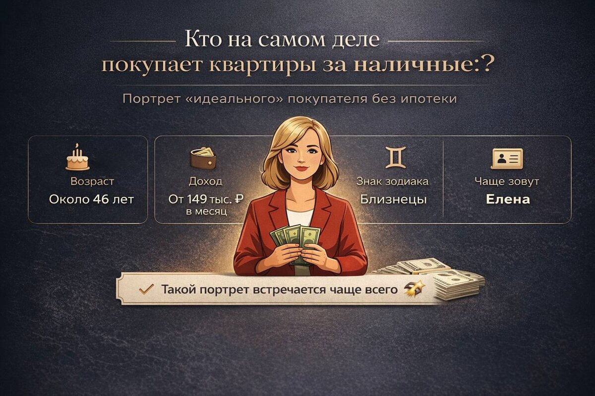 Многие уверены, что недвижимость за наличные (имеется ввиду — за свои) покупают только миллионеры. Но статистика показывает совсем другую картину. Домклик проанализировал сделки и составил портрет покупателя квартиры без ипотеки. Разбираем самого «типичного» покупателя❗️ ❗️Пол: женский Да, это чаще женщина. 61,5% сделок за наличные совершают именно они. Мужчины — лишь 38,5%. Самые популярные имена среди покупательниц: • Елена • Татьяна • Ольга • Наталья • Ирина А среди мужчин чаще встречаются: • Александр • Сергей • Алексей ❗️Возраст Средний возраст покупателя — около 46 лет. При этом почти каждая вторая сделка за наличные приходится на людей от 36 до 50 лет. ❗️Доход Средний доход покупателей — около 341 тыс₽ в месяц. Но интересный момент: медианный доход — 149 тыс₽. Почему такая разница? Потому что многие покупают жильё без кредитов через альтернативные сделки: 1⃣продают старую квартиру 2⃣добавляют накопления 3⃣покупают новую Поэтому купить квартиру без ипотеки могут и лю