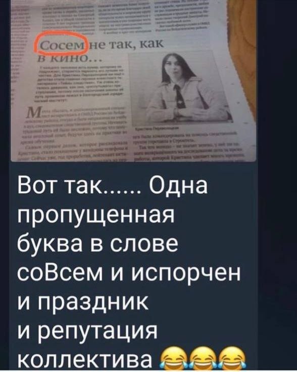 Вчера в чате со студентами обсуждали эпичные опечатки. Наш куратор поделился: Тут не могу не вспомнить часто встречающиеся опечатки наборщиц типа «Еблоруссия». А один раз видел такое: «Борис Николаевич взял нас ебя управление страной» Ольга рассказала: Я в газете 19 лет. Чего только ни выходило! И отрытое общество, и ебельная фабрика, и пенис соловья Ещё одна Оля повеселила: А мы в офиц.письме написали «члену Губернатора» вместо «члену совета Губернатора», и все пропустили 😁 Ну а победитель на фото 🤣 Делитесь, что у вас было? 🟠Вёрстка для дизайнера