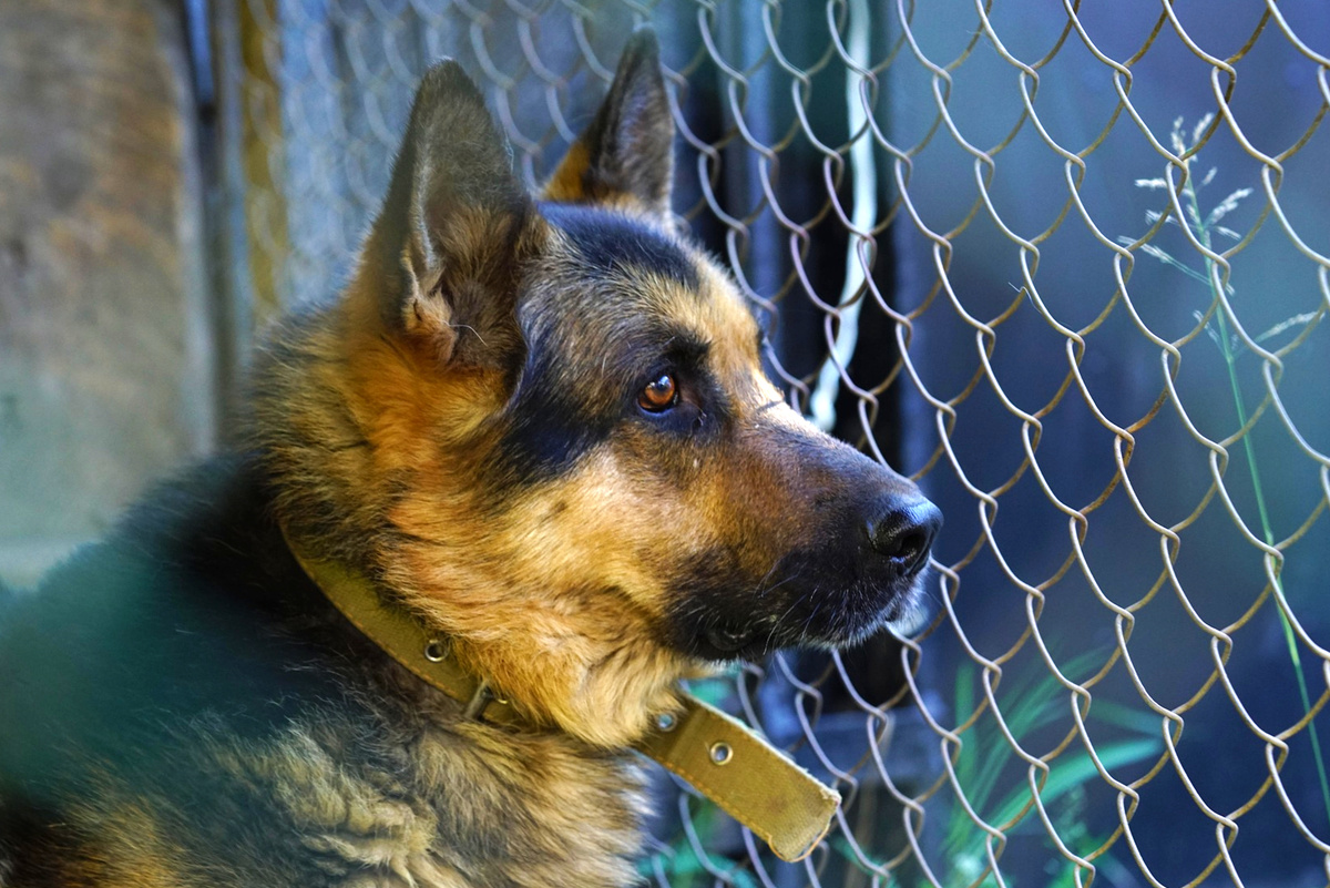 Пёс, находясь в вольере, смотрел на хозяина грустными глазами и никак не мог поверить, что человек, которому он доверял всем сердцем и которого любил больше жизни, оставил его тут одного.