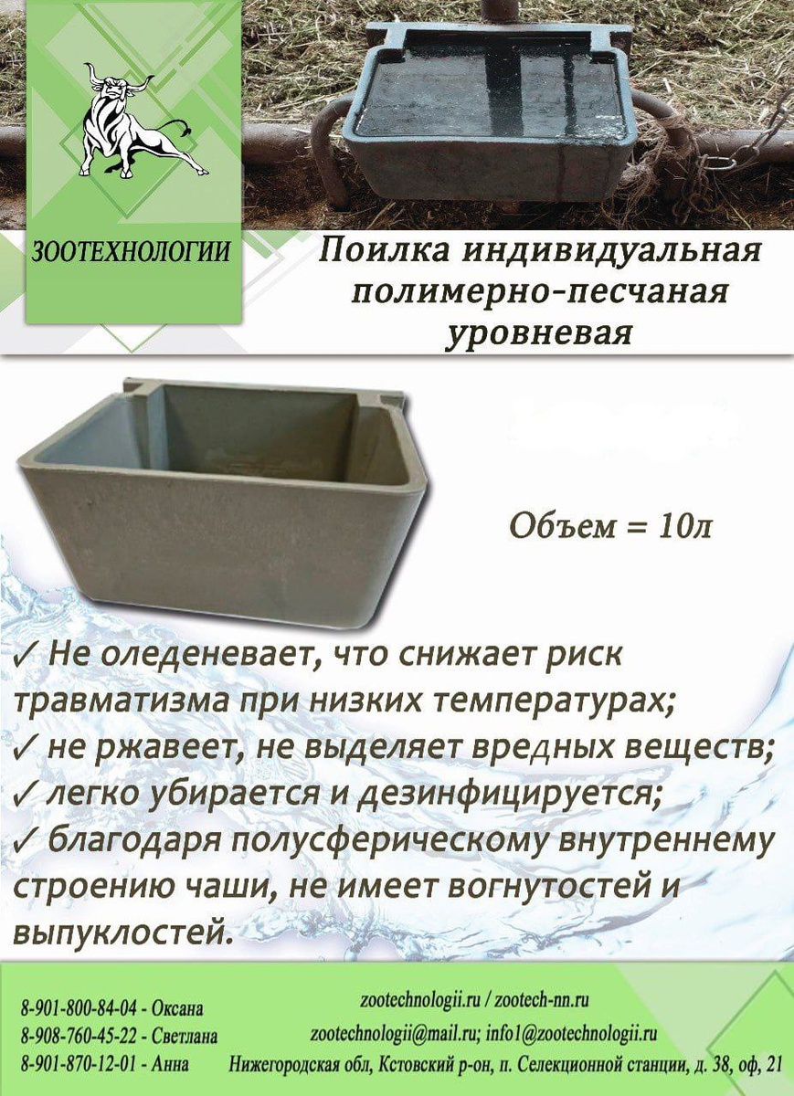 Добрый день. 💦 В продаже уровневые песчано-полимерные поилки для коров объёмом 10 литров, которые предназначены для обеспечения животных достаточным объёмом питьевой воды. 🌟 Такие поилки используются в системах уровневого поения — оборудовании для привязного содержания крупного рогатого скота (КРС). Они позволяют автоматически наполнять поилки водой и поддерживать необходимый уровень для каждой коровы. ⚙️ Некоторые особенности использования: 🔜Изолированность поилки от общей системы исключает риск заражения животных через воду. 🔜Сливное отверстие на дне поилки упрощает её очищение в случае загрязнения. 🔜Обратный клапан защищает трубопровод от засора. 🔜Возможность подогрева воды (опционально). Оставить заявку можно у наших менеджеров: Оксана: 8-901-800-84-04; 8-908-760-45-22 Светлана : 8-908-742-37-86 Анна: 8-901-870-12-01 Юлия: 8-902-787-47-33 Смотрите нас на Rutube✔️ #Поилка_полимерн