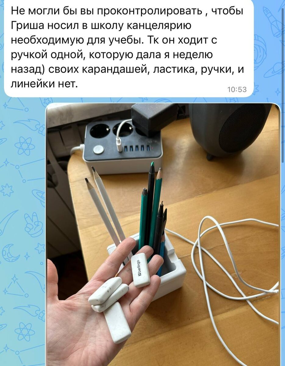 )))) Вчера пишет классная (скрин), сын приходит в школу с одной только ручкой, говорит что ДОМА НИЧЕГО НЕТ😁 Верите-нет, я постоянно ему напоминаю про канцелярию, но мне он говорит что НИЧЕГО ЭТОГО НЕ НУЖНО в школе))))) Вот такой вот у нас аскет растёт)
