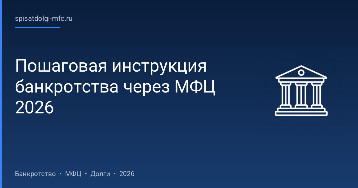 Процедура банкротства через МФЦ стала доступной в 2020 году и значительно упростила жизнь должников. В 2026 году этот механизм продолжает работать, позволяя гражданам списать долги без обращения к арбитражному суду. Рассмотрим подробно, как правильно оформить банкротство через многофункциональный центр. Внесудебное банкротство через МФЦ доступно не всем должникам. Существует ряд обязательных условий, которые необходимо соблюсти. Основные требования: Важно понимать, что если у вас есть ценное имущество или стабильный доход, процедура через МФЦ недоступна. В таких случаях необходимо обращаться в арбитражный суд. Для подачи заявления о банкротстве в МФЦ потребуется собрать полный пакет документов. Список довольно обширный, поэтому рекомендуется заранее подготовить все справки. Обязательные документы: Также потребуются документы, подтверждающие задолженность и невозможность её погашения. Сюда входят справки от приставов, решения судов, документы о прекращении исполнительного производства.