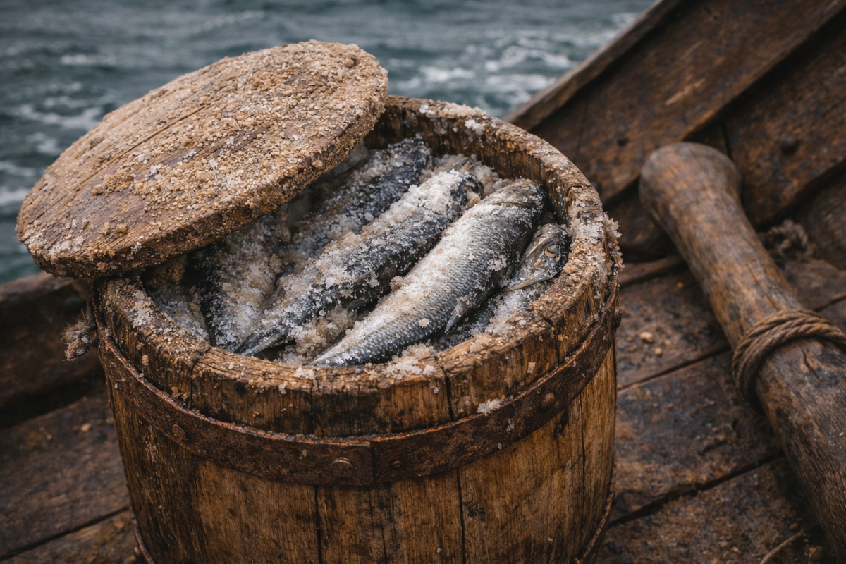 Солёная сельдь была вторым стратегическим продуктом. Норвежские, датские и шведские воды буквально кишели сельдью, особенно в Скагерраке и Балтийском море. Засолка в деревянных бочках делала её пригодной к хранению на протяжении нескольких месяцев. Сельдяные бочки упоминаются в сагах, в скандинавских инвентарях и в находках из портовых раскопок как один из самых распространённых торговых товаров.