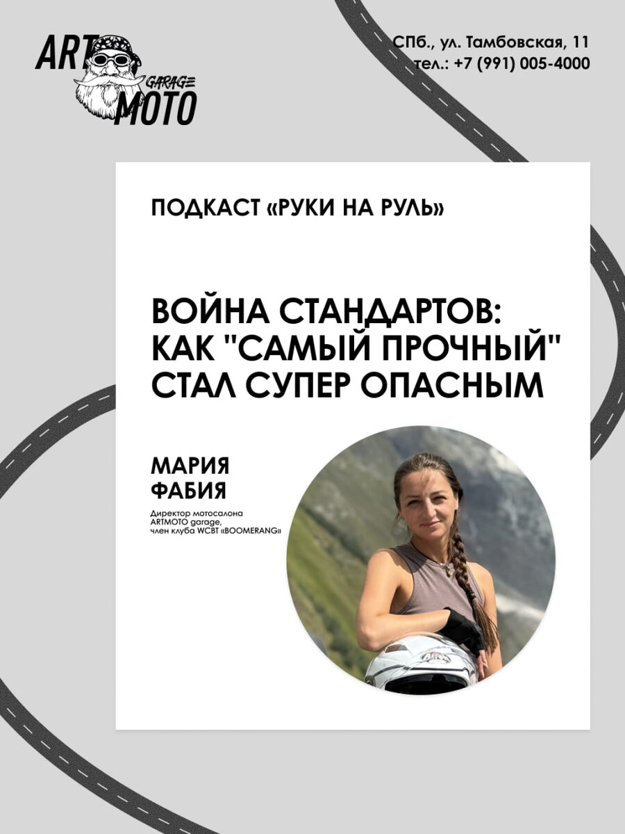 Мотошлемы - как "самый прочный" стал самым опасным? ► Подкаст программы: https://podcasts.apple.com/ru/podcast/id1288506147?i=1000755169218 ────────── Война стандартов: как "самый прочный" стал самым опасным. Рассказ о том, как благие намерения и любовь к несокрушимости привели к появлению «танков на голове», которые ломали шеи, но считались вершиной безопасности. Ведущая программы - директор «ARTMOTO garage», член мотоклуба WCBT «Boomerang»— Мария Фабия. ✅ ARTMOTO garage — это не просто магазин мототехники и экипировки. Это точка притяжения для всех, кто живет мотоциклами. Место, где каждый мотоциклист найдет что-то для себя: будь то техническое обслуживание, яркие события, новые знания или единомышленники. Тамбовская улица, 11, Санкт-Петербург #artmotogarage #экипировка #мотоциклы