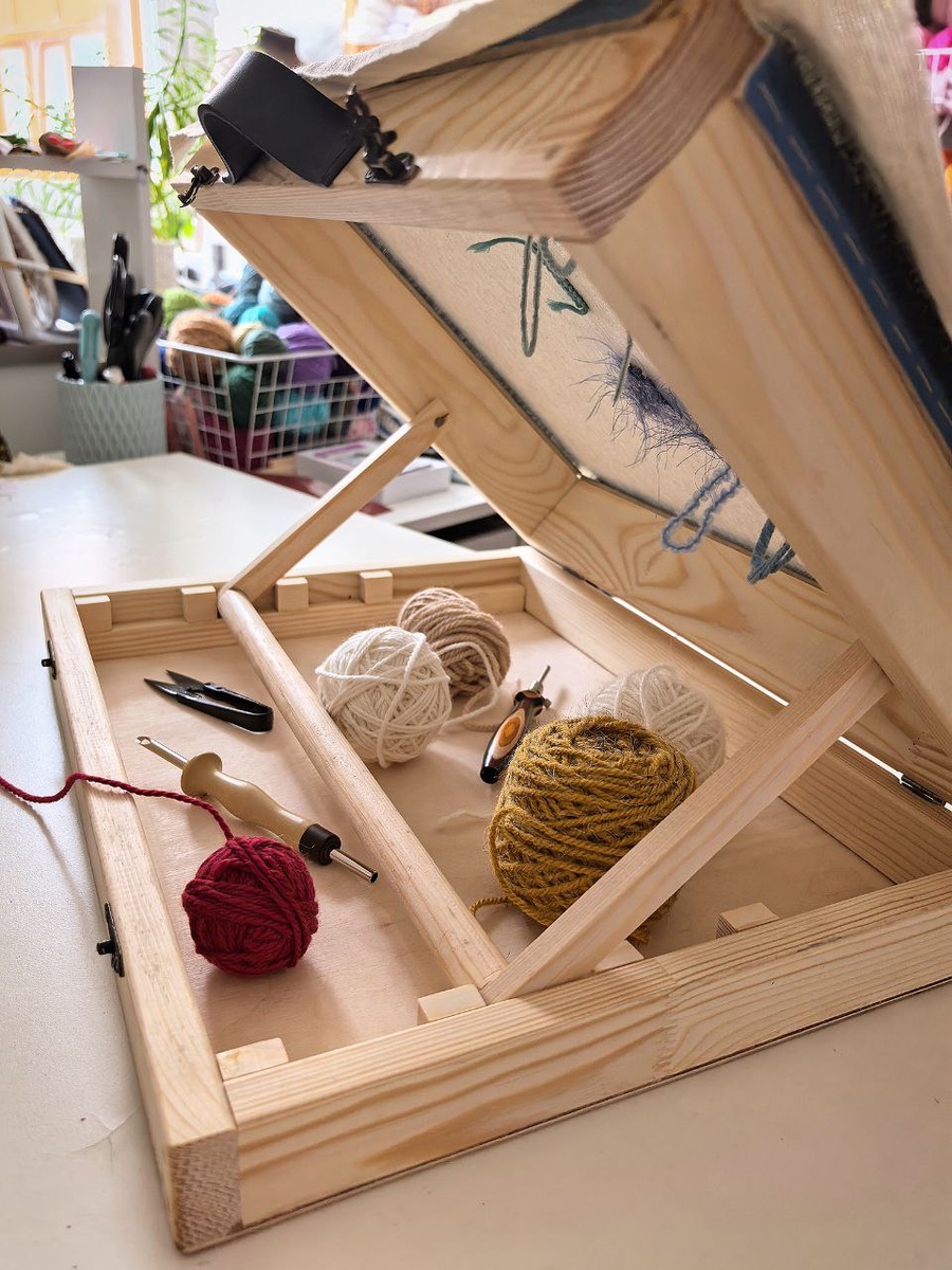 она увидела конструкцию на пинтерест и заказала нам собрать похожую. это было не просто и мужу пришлось провести очень много часов в гараже, но результатом все довольны. теперь могу смело сказать, что мы можем любую раму для вас сделать: с ногами, в виде чемодана, просто настольную