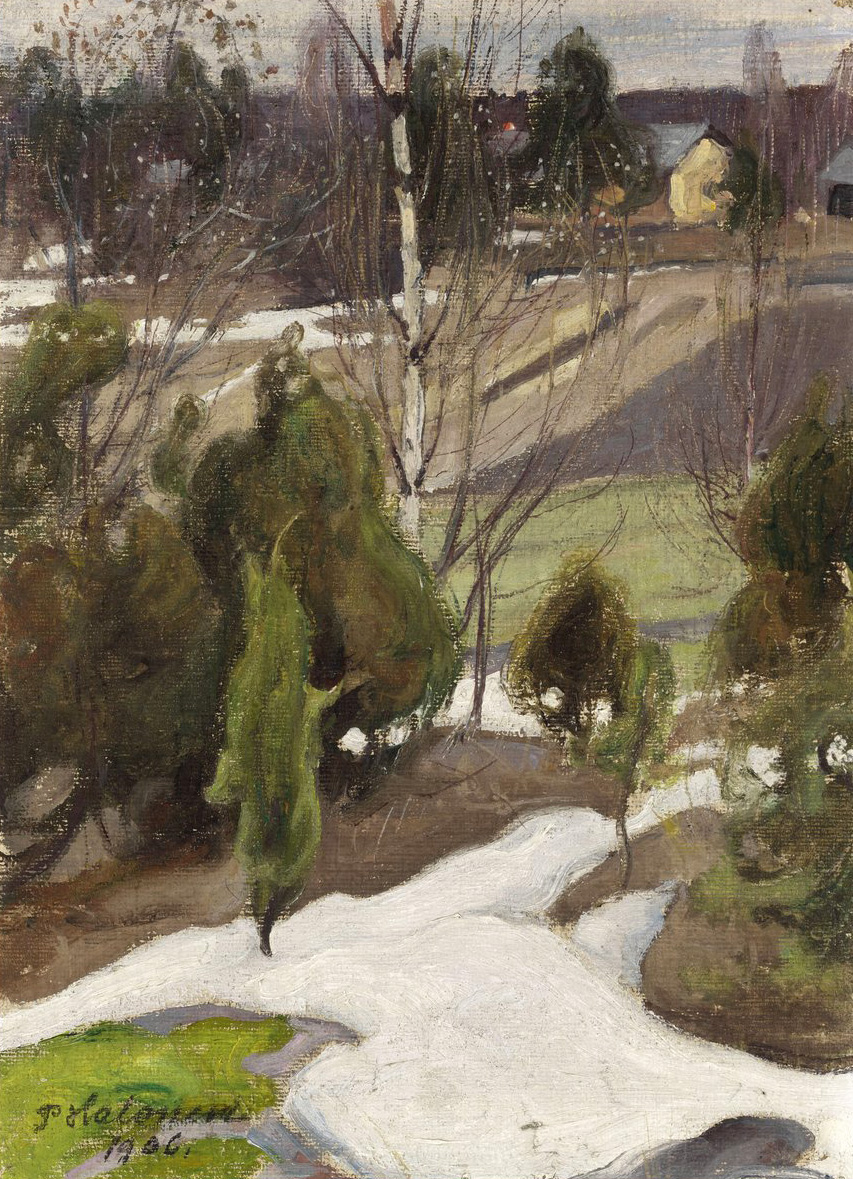 Зимние пейзажи, написанные Пеккой Халоненом (1865–1933) после 1895 года, в основном в Восточной Финляндии, выделяются среди других пейзажей художника. Эти картины — воплощение времени года, которое определяло облик Финляндии почти шесть месяцев в году. В своих работах ему удавалось передать как яркую, солнечную, хотя и морозную сторону этого преобладающего времени года, так и его мрачные, серыеи суровые виды. Халонен всегда работал на открытом воздухе, даже когда температура опускалась ниже нуля. Небольшой (35.3 x 26 см) рассматриваемый пейзаж портретного формата — это тонкое изображение перехода к весне после долгой северной зимы. На склонах, постепенно зеленеющих, всё ещё видны снежные пятна разного размера. На вершине холма можно различить несколько домов, а небо в верхней части картины представляет собой лишь узкую полоску. Сдержанные цветовые пятна Халонена восходят к синтезу Поля Гогена (1848–1903), который он сочетает с кривыми линиями, вдохновленными стилем модерн. Наря