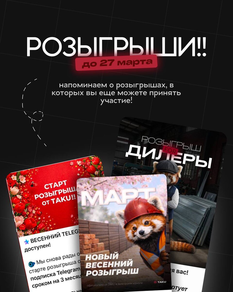 ! 📌 ℹ️ В нашем Telegram-канале прямо сейчас проходят 3 розыгрыша, в которых вы ещё можете принять участие! ⚡️ Первый розыгрыш — дарим одному из вас Telegram Premium за подписку! ⚡️ Второй розыгрыш — разыгрываем перфоратор Nocord также за подписки!! ⚡️ Третий розыгрыш для дилеров — скидка на следующий заказ! Проверьте закреплённые посты, выполните простые условия и не упустите шанс забрать свой приз! С нами TAKUдобно! 🔹 #TAKU #розыгрыш #Telegramрозыгрыш #перфоратор #TelegramPremium #выиграй #скидка #длядилеров