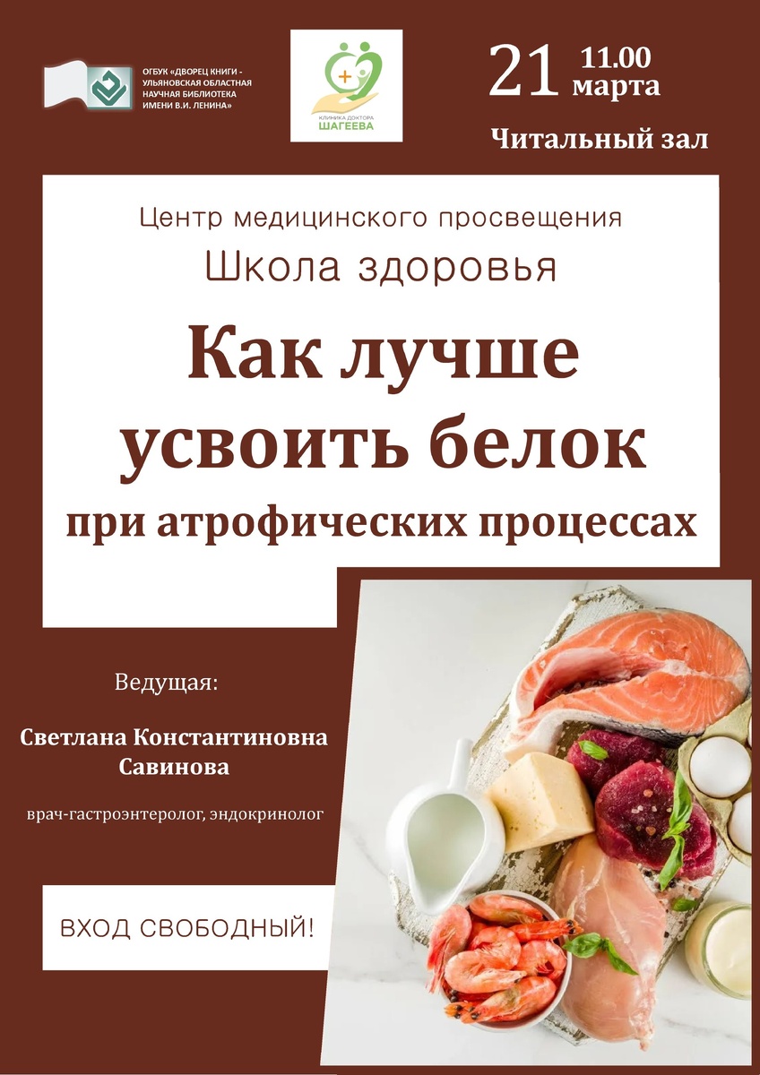 усвоить белок при атрофических процессах». 🥣 Белок необходим для правильного функционирования организма, без него не будет здоровых костей, сдаст позиции иммунитет. Когда человек ест мало белка, нарушается работа многих систем организма, а иногда такое случается при полноценном рационе – если белок не усваивается. 🔎 Почему это происходит, чем опасно и как предотвратить, расскажет врач-гастроэнтеролог, эндокринолог, врач интегративной медицины Клиники доктора Шагеева Светлана Константиновна Савинова. Вход свободный! Телефон для справок: +7(8422)44-30-85 - читальный зал Дворца книги. 👉 Подробнее - на сайте: https://clck.ru/3SXjzG #ДворецКниги_афиша #КультураДляШкольников