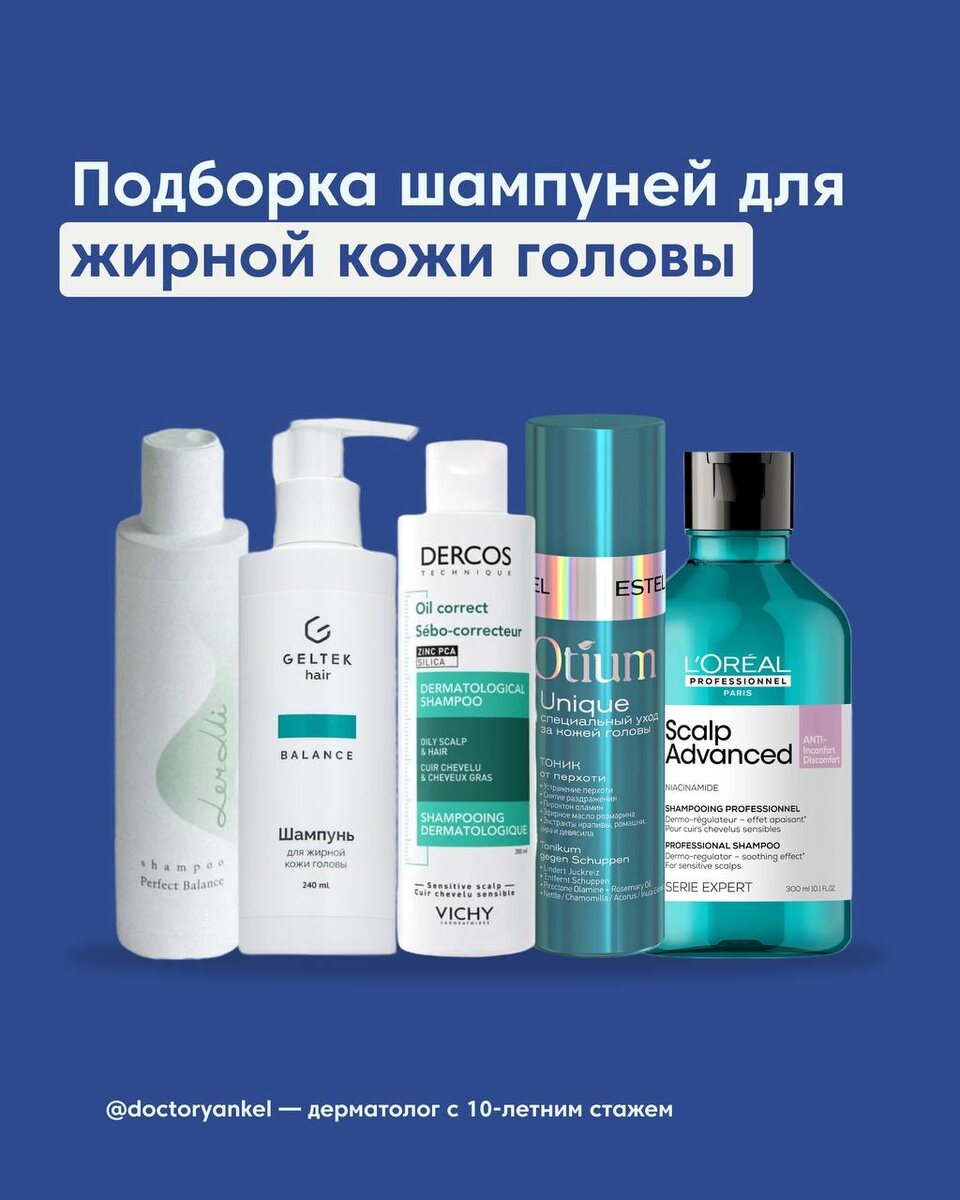 1. Vichy Dercos — регулирующий шампунь-уход Содержит салициловую кислоту, термальную воду Vichy и комплекс Anti-Sebum. Замедляет образование кожного сала, приподнимает пряди у корней. Хороший вариант, если жирность сочетается с чувствительностью. 2. LerMi — шампунь для жирной кожи головы Российский бренд, ориентированный именно на проблему гиперсальности. Хорошо справляется с очищением корней без пересушивания, формула без лишних добавок. Цинк РСА, сера МСМ, ниацинамид и салициловая кислота — отличное комбо для жирной кожи. Подходит для регулярного использования 3. Geltek — шампунь для жирной кожи головы Цинк и ниацин нормализуют работу сальных желёз, салициловая кислота деликатно отшелушивает. Российский аптечный бренд с очень достойным соотношением цены и состава. 4. Estel Professional Otium Unique Отличный вариант для тех, у кого жирная кожа головы сочетается с сухими, повреждёнными или окрашенными волосами. Активные компоненты синергетически воздействуют на кожу головы и во