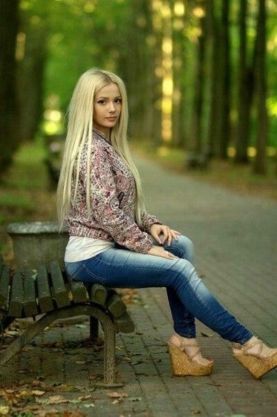 Её поза непринуждённа, но в то же время изящна: одна нога вытянута вперёд, другая согнута, будто она только что присела отдохнуть после лёгкой прогулки. На ней облегающие джинсы, подчёркивающие стройность фигуры, и уютный свитер с нежным узором, который добавляет образу нотку домашнего тепла. Светлые босоножки на танкетке завершают образ, придавая ему лёгкость и непринуждённость.