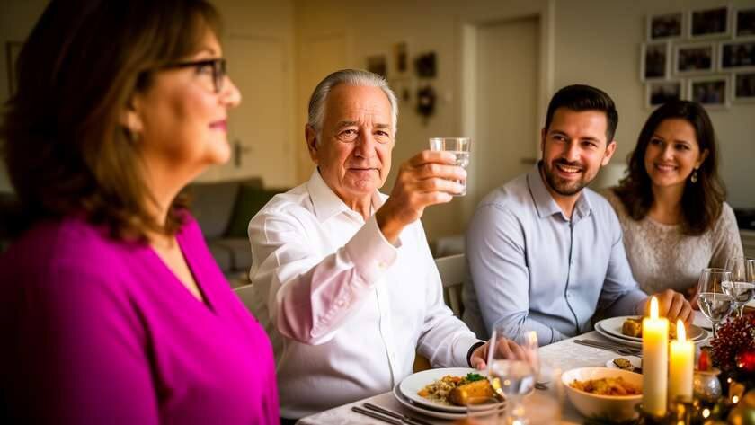 Она сняла фартук, пригладила волосы и вошла в зал. Владимир уже сидел во главе стола, налил себе напитка, посматривал на телефон. Андрей с Олей устроились рядом, разговаривали о чём-то своём. Никто не обратил внимания, как она вошла. Валентина села на своё место, сложила руки на коленях.