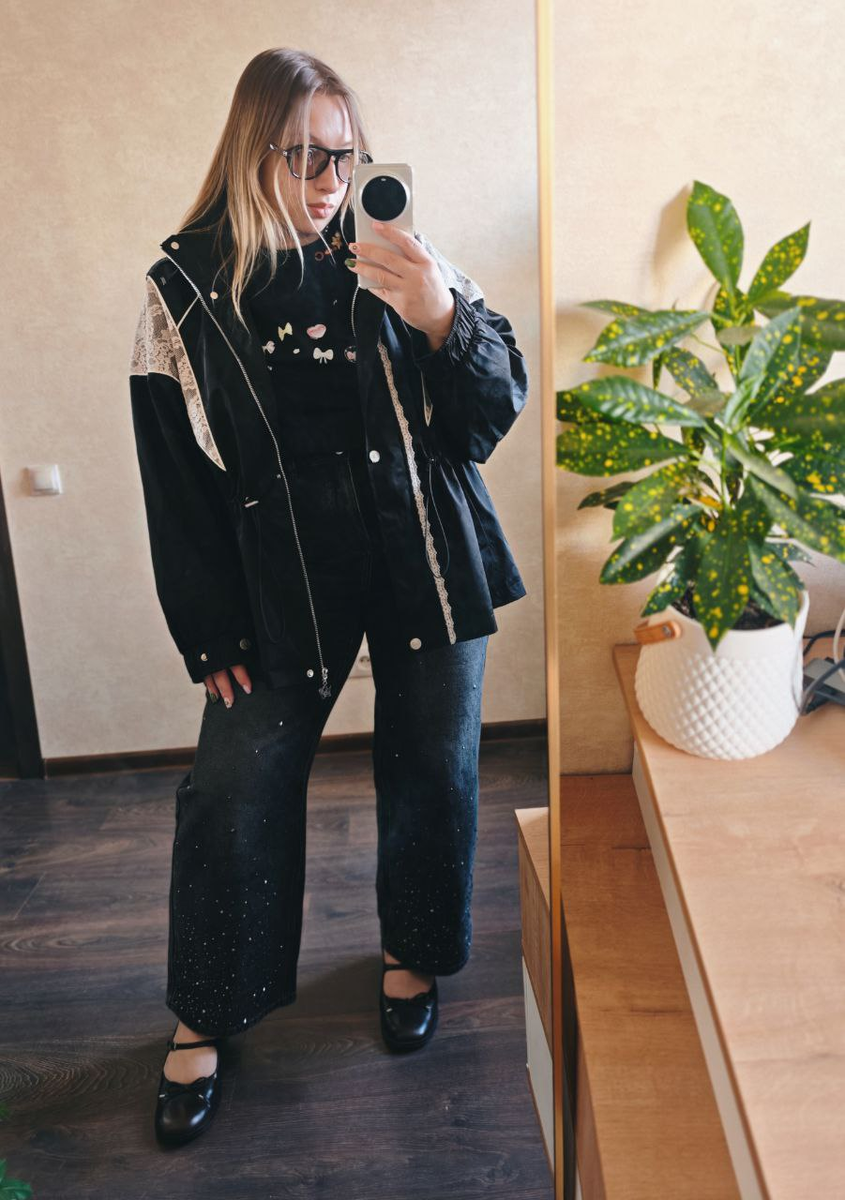 ссылка на ветровку Сейчас в моде игра с текстурами. Эта ветровка — не просто функциональная куртка, а стильный аксессуар. Секрет в материале: плотная ткань с набивным рисунком, вставки из нежного кружева молочного цвета, актуальный ворот-стойка. Я взяла размер М. Ткань отлично держит форму, ветровка сидит красиво, не мешкуется. Ветровка огонь! Выглядит дорого и стильно. Отличный вариант на весну. Очень довольна!
