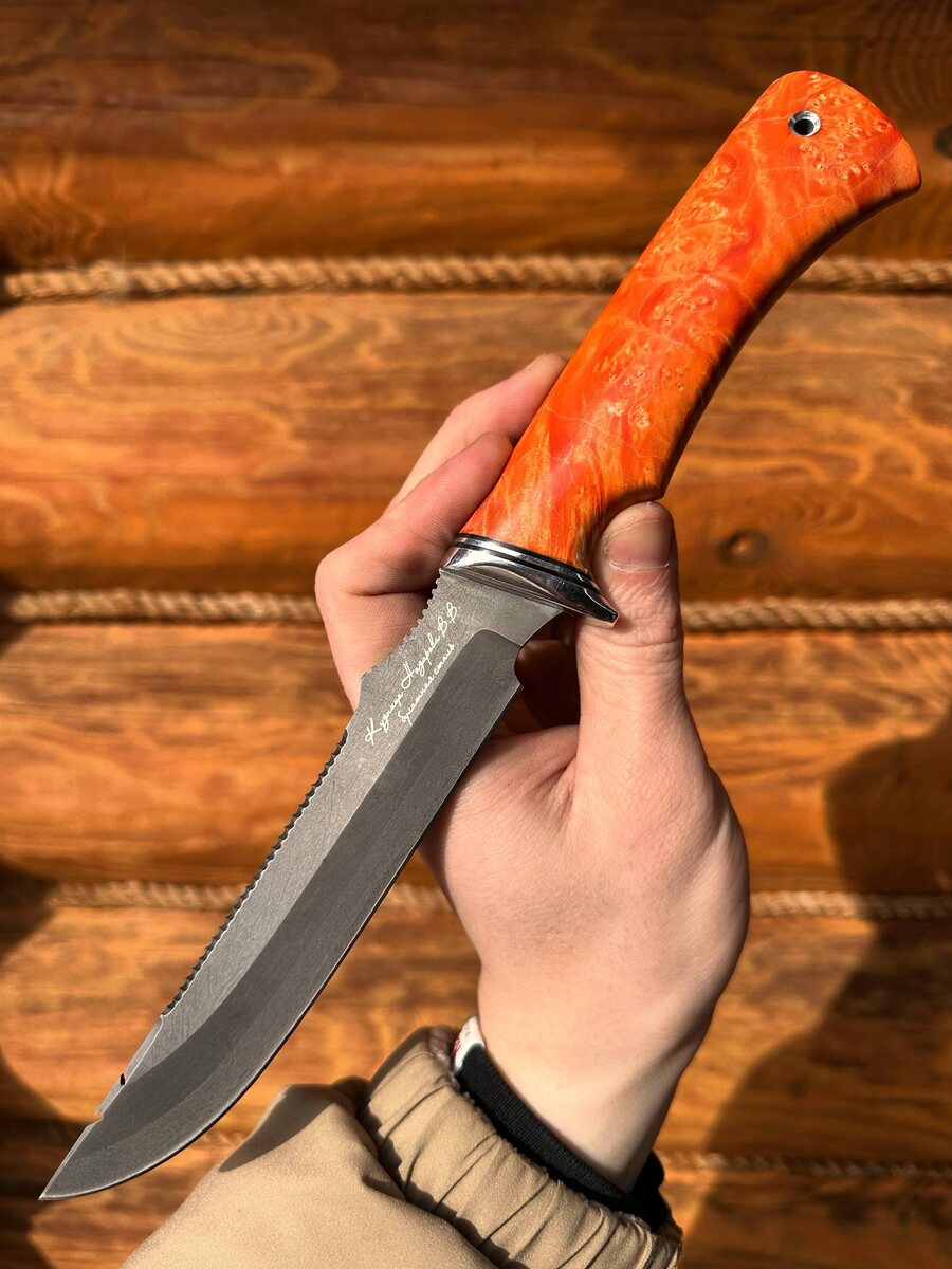 🔥 Лучший выбор для рыбалки и подарка ценителю! - Тигельный булат с твердостью 64-65 HRC — идеален для длительной эксплуатации и реза «как бритва». - Серрейтер на обухе — быстро и аккуратно снимите чешую с рыбы, даже на выезде. - Экстрактор — удобно достаньте воблер или крючок из пасти рыбы. - Прочные спуски от середины — нож не боится боковых нагрузок, подходит для разделки и тяжелых работ. - Рукоять из капа клена (яркий оранжевый оттенок) с анатомической формой — удобно лежит в руке даже во влажных условиях. - В комплекте — ножны из натуральной кожи. Есть опция формованных ножен (+8000₽). 💸 Цена сейчас — 12.000₽ (вместо 19.000₽)! Пожизненная гарантия на отсутствие производственных дефектов. 💬 Пишите для заказа: Telegram: [@Nazarklinokbot](https://t.me/Nazarklinokbot) WhatsApp/Viber: [+79101343831](https://wa.me/79101343831) #рыбалка #ножидлярыбалки #ручнаяработа #кузницаназарова #булат #идеальныйподарок