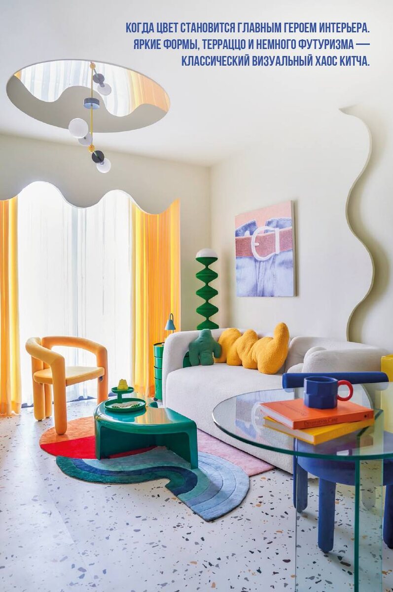 » 🎭 Китч - направление, которое долго считалось почти антиподом «хорошего вкуса». Но сегодня он всё чаще возвращается в интерьеры - уже как осознанный, ироничный и очень живой стиль. Что такое китч? ▪️Изобилие цвета и декора 🎨 Китч - это всегда много всего: яркие цвета, принты, фактуры, блеск, пластик, золото, текстиль, необычные формы. Здесь редко есть чёткий композиционный центр, внимание рассеивается между множеством деталей, которые словно соревнуются друг с другом. ▪️Сочетание несочетаемого 🏛️✨ Китч любит смешивать эпохи и стили. Барокко может соседствовать с пластиком, винтаж с неоном, а античная скульптура быть покрыта граффити. Старинная мебель может внезапно получить яркие пластиковые детали. Это своего рода визуальный коллаж из разных времён. ▪️Ироничные предметы 🐠🍌 Китч часто проявляется через необычные предметы интерьера, которые имитируют что-то другое. Диван в виде банана, лампа-рыбка, чайник-котик, журнальный столик-скульптура - всё это про игру, юмор и немного