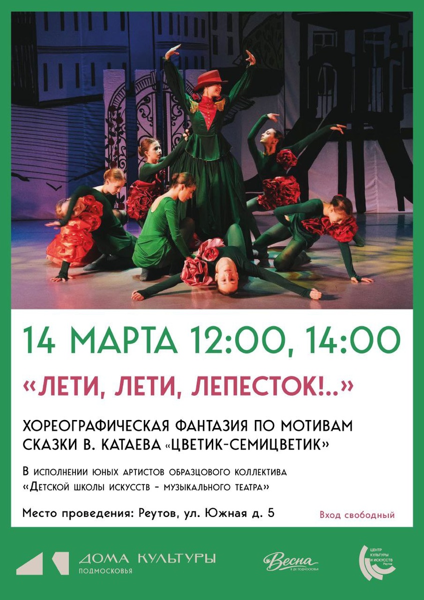 !..» Дорогие друзья! Приглашаем вас на трогательный и красивый спектакль по мотивам доброй сказки В. Катаева «Цветик-семицветик» 🌸 В исполнении юных артистов Образцового коллектива «Детской школы искусств — музыкального театра» оживёт история о мечтах, дружбе и настоящих чудесах, которые мы можем подарить друг другу. 📅 Когда: суббота, 14 марта ⏰ Начало: в 12:00 и в 14:00 📍 Где: г. Реутов, ул. Южная, д. 5 🎟 Вход свободный! Ждём вас всей семьёй — подарите детям и себе встречу с доброй сказкой! ✨ «Мой Реутов» в MAX: https://max.ru/reutov_today