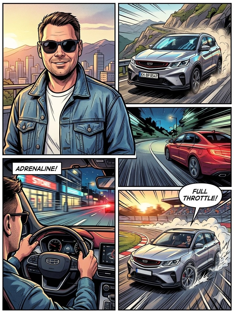 Загружаем фото своего автомобиля + свою - получаем забавный комикс :) Делитесь своими авто в комментариях !! **Стиль и техника** Создай яркую иллюстрацию в стиле нео-комикса с автомобильной тематикой. Используй чистые выразительные линии, богатую растровую штриховку и насыщенные контрастные цвета. **Персонаж** Перенеси внешность человека с прикреплённого референсного фото максимально точно. Сохрани черты лица, структуру кожи, выражение и детали причёски в точности как на фото. Внешность должна быть узнаваемой во всех панелях без изменений. Одежда подбирается по полу персонажа с фото: *Женский образ:* слегка оверсайз джинсовая куртка, белая майка, джинсовые шорты, фланелевая рубашка, завязанная на талии, солнцезащитные очки, расслабленная уверенная поза. *Мужской образ:* слегка оверсайз джинсовая куртка, белая футболка, прямые джинсы, кроссовки, солнцезащитные очки, та же уверенная поза. **Автомобиль** Воспроизведи автомобиль точно по прикреплённому фото. Сохрани форму кузова, цве