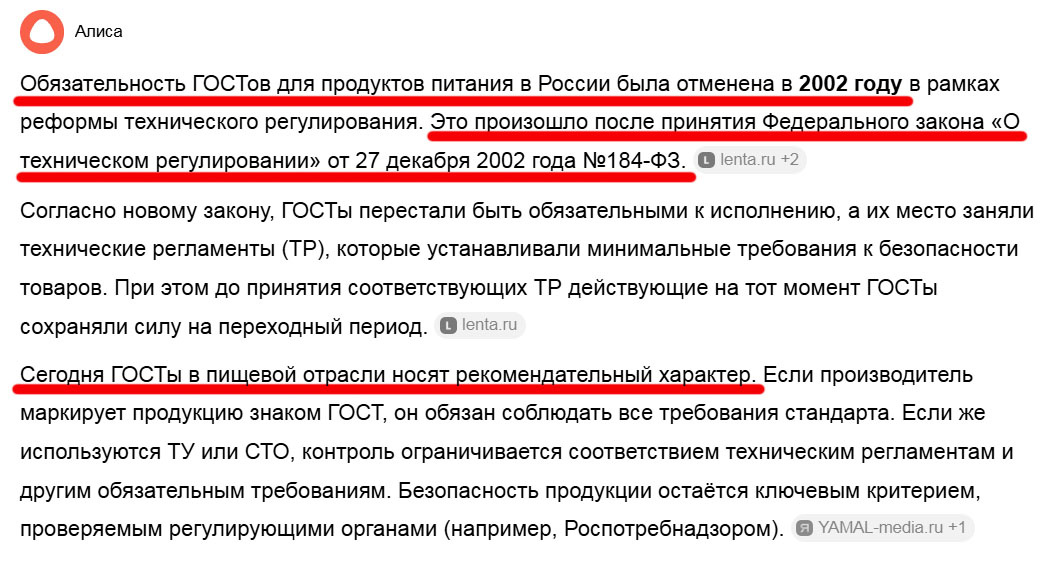 Депутат Госдумы взболтнул недавно явно лишнее, раскрыв тайну продуктового изобилия в стране: Никто не заставляет бизнес вписываться в рамки конкретного ГОСТа, пока он сам этого не захочет. Это значит, что производитель сам решает, работать ему по ГОСТу, по техническим условиям или по собственному стандарту организации. Правда, он ничего нового не сказал, а лишь озвучил то, что и так знают те, интересуется причинами падения качества продуктов питания и обилия суррогатов и фальсификатов на полках магазинов. И эта причина -- отмена обязательности ГОСТов в 2002 году: Неудивительно, что сразу после этого производство колбасы в России резко выросло: А чего бы ему не вырасти, если в колбасы теперь можно пихать всё, что захочешь? Вот производители и начали заменять говядину и свинину сперва курятиной, а затем просто отходами забоя скота и птицы, именуемыми мясом мехобвалки. То же самое произошло и с молочными продуктами, в которых теперь допустимо использовать вместо молока пальмовое масло и п