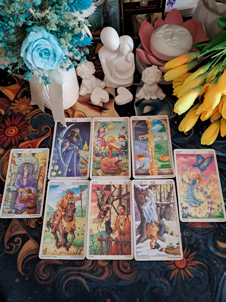 Судьба готовит вам мощный толчок, который выбьет почву из-под ног в старых, изношенных сферах (серп, двойка пентаклей, правосудие уходят). Освободившееся место заполнится вихрем событий: вас понесет поток (рыцарь жезлов, 8 жезлов), но затем потребуется пауза и переоценка (повешенный). Главное — не потерять голову от иллюзий (7 кубков) и прислушаться к мудрым советам (верховный жрец).