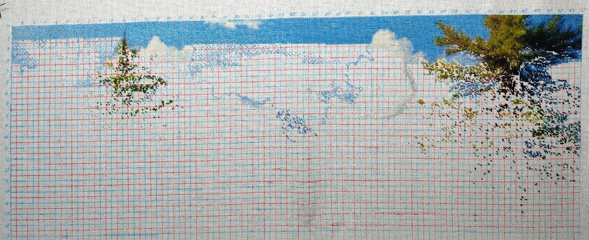 Ему на этой неделе досталось 4 дня и вышито 4156//. Прошли весь центр ряда, небо от одной сосны до макушки другой. Впереди еще один большой участок неба с левого края и конец 2го ряда. Так как я по рядам иду зигзагом: слева на право, затем справа на лево, и тд; в предстоящую неделю буду вышивать небо на левом краю.