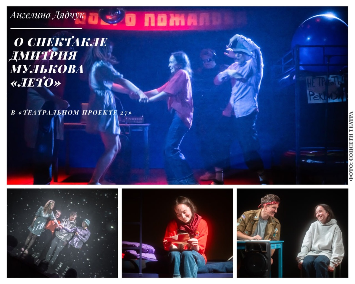 #Ангелина_Дядчук — о спектакле Дмитрия Мулькова «Лето» в «Театральном проекте 27»: «Сюжет разворачивается вокруг старшеклассницы Лизы (Дарья Теплова), которая в один зимний день решила втайне от мамы прогулять школу и отправиться в лагерь, где проводила летние каникулы. Действие спектакля происходит в двух временных категориях. Условное „настоящее” показано через видеопроекцию на полупрозрачном экране, которым затянуто зеркало сцены: на видеозаписи под блёклым зимним небом проплывают серые многоэтажки, звучат монотонные повседневные вопросы матери... Остановившись у дверей школы, Лиза не заходит внутрь, а сбегает в другом направлении — в лагерь, где проводила летние каникулы. Это волшебное место подарило Лизе новых друзей и первую любовь, а её жизнь заиграла новыми красками. Воспоминания о летних деньках будто оживают на сцене и воплощаются актёрами за полупрозрачным экраном, который даёт легкий эффект туманности и размытости: так любые впечатления со временем бледнеют, теряют острот