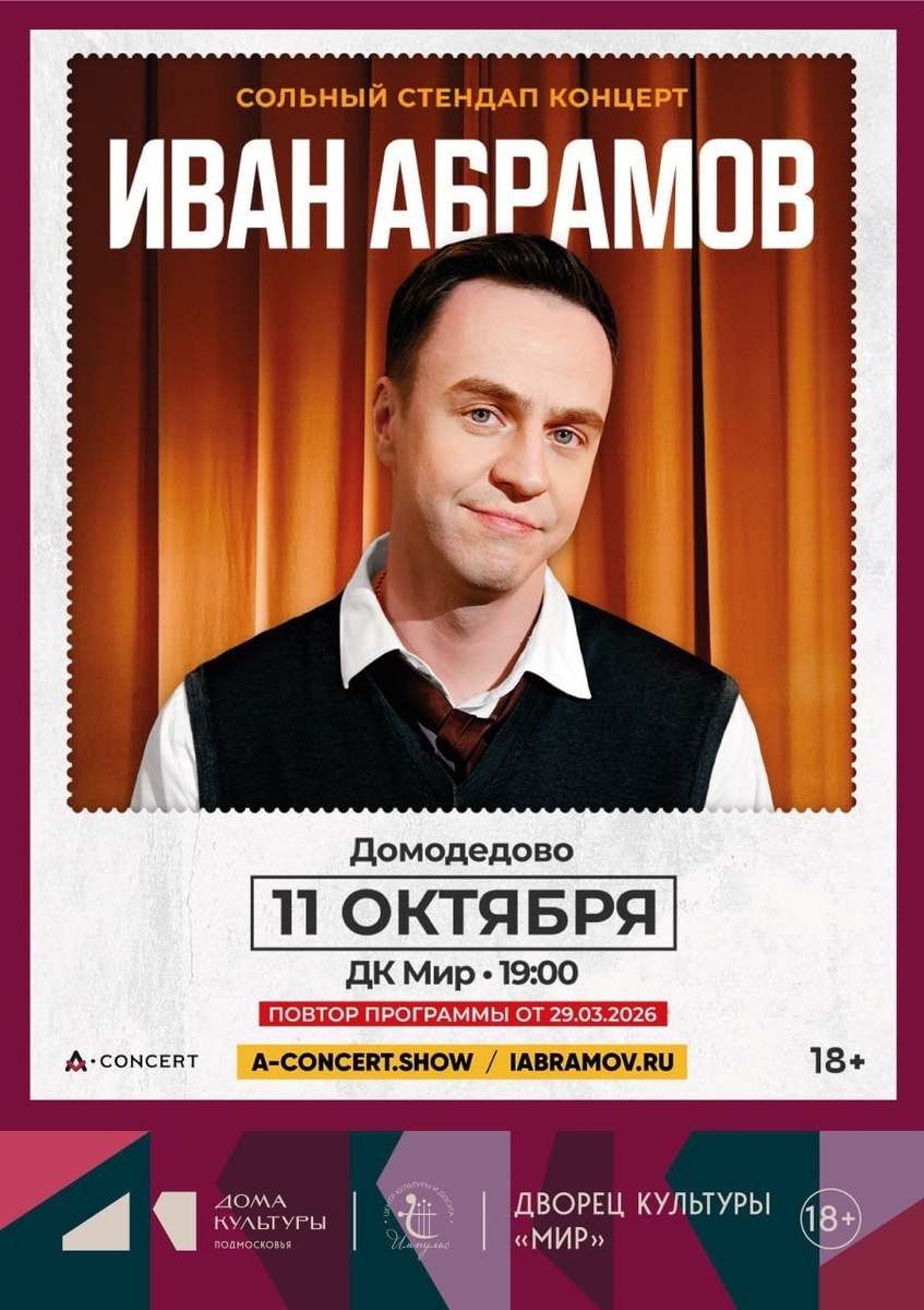 ✨ НОВОСТЬ-БОМБА!💥 Дополнительная дата концерта Ивана Абрамова «Всё из детства»!🎤 ✨ Иван Абрамов, как и прежде – жизненно, харизматично, музыкально, а для самых осознанных – психологически близко и по-настоящему смешно. ✨ Новая программа «Все из детства», которую можно смело назвать не просто stand up, а концерт-терапия для самых осознанных и готовых к погружению зрителей. При этом она будет, как всегда, наполнена, неповторимым абрамовским юмором, который отличает его от всех других комиков. 🚫 Возраст: 18+ 📆 11.10.2026🕒19:00 🏢 Дворец культуры и спорта «Мир» 📍 г. Домодедово, Каширское шоссе, д.100А 💰 Вход свободный❗️ ✅ Мероприятия Домодедово https://dzen.ru/id/66f10385cc4c5a16f7b5fb02 https://vk.ru/domodedovo_events http://dzen.ru/domodedovo_events