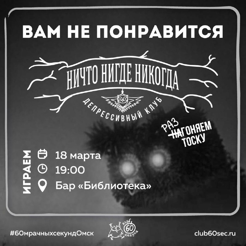 Интеллектуальная игра с темами грусти, печали и недосказанного. Участники погрузятся в атмосферу тоски через раунды с живописью, стихами, песнями о смерти и финалом со ставками. Начало: 18 марта 2026 19:00 Стоимость: От 250.0 руб. до 750.0 руб. Адрес: г Омск, пр-кт Карла Маркса, д 18 к 2 Организатор: https://vk.com/public186204342 💧 Ничто. Нигде. Никогда. Игра, которая возвращается каждый сезон ровно в тот момент, когда хочется завернуться в плед, вздохнуть потяжелее и признать: да… снова это всё. 🌫 Разминка — мягкое, но уверенное погружение в тоску мирового масштаба. Вопросы о грустном, печальном, недосказанном — идеальный разогрев перед интеллектуальной мрачинкой. 🖼 Смертопись — живопись, исполненная тоски и грусти. Попытаемся узнать картины по... #развлечения_игры_и_конкурсы Узнать подробности, адрес или записаться на событие.