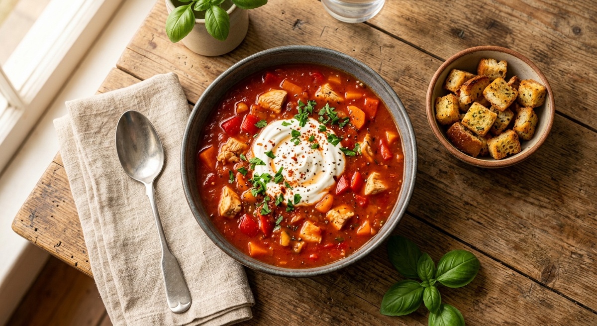 Этот суп — настоящая палочка-выручалочка, когда хочется чего-то яркого, сытного, но не слишком тяжелого. Томатная основа дарит потрясающий насыщенный вкус и красивый цвет, курица делает суп сытным, а овощи — полезным. Густой, ароматный, с легкой кислинкой — он точно прогонит хандру и согреет в прохладный день!