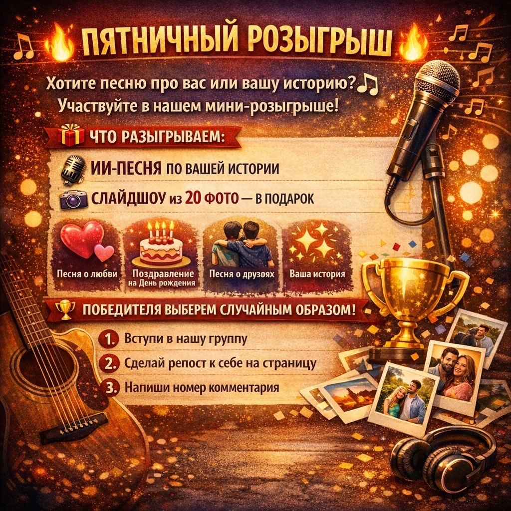 🔥 Хотите песню, созданную специально про вас или вашу историю? 🎵 Тогда участвуйте в нашем мини-розыгрыше! 🎁 Что разыгрываем: 🎤 ИИ-песня по вашей истории 📸 Слайдшоу из 20 ваших фото — В ПОДАРОК Вы можете выиграть: ❤️ песню о вашей любви 🎂 поздравление на день рождения 👫 песню о друзьях ✨ или любую вашу историю 📌 Чтобы участвовать: 1️⃣ Вступите в нашу группу 2️⃣ Сделайте репост этой записи к себе на страницу 3️⃣ Напишите в комментариях номер своего комментария 💬 Чем больше участников — тем интереснее розыгрыш! 🏆 Победителя выберем случайным образом 📅 Итоги подведём в следующую пятницу Удачи всем участникам 🍀 Возможно, именно ваша история станет песней 🎶 Присылайте ваши новости в сообщения нашего канала Источник: Открыть
