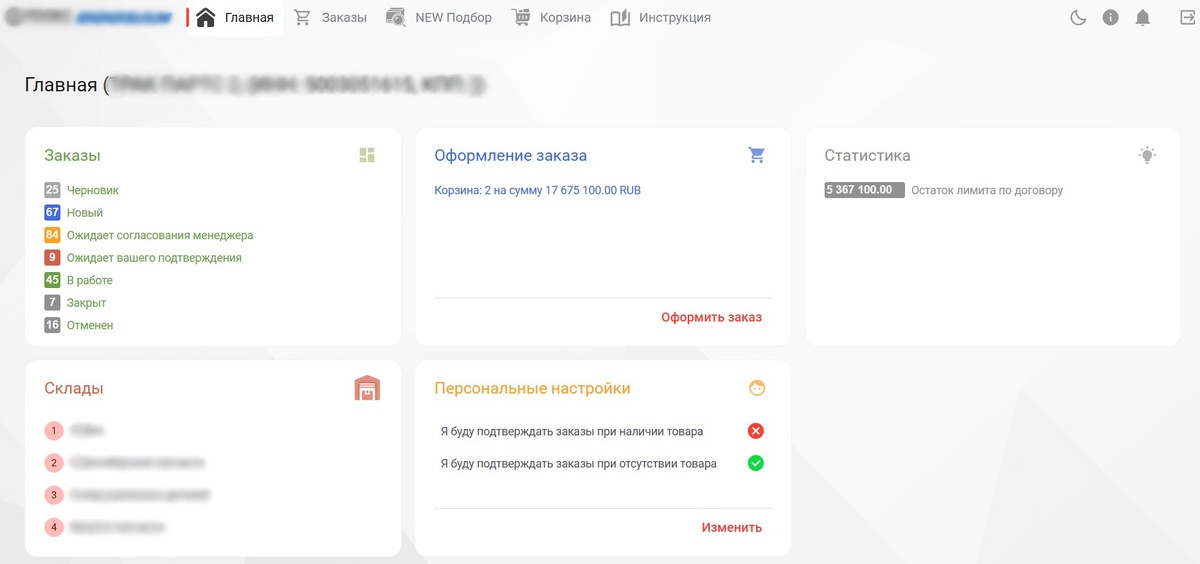 Портал был адаптирован под специфику бизнеса дистрибьютора запчастей и включает следующие ключевые возможности: