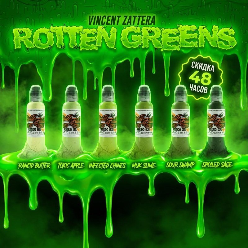 🎉 VINCENT ZATERRA ROTTEN GREENS INK SET (6 шт) Палитра, созданная для глубины, объёма и сложных природных оттенков — от гнилой зелени до насыщенных тёмных тонов. Сет от World Famous Tattoo Ink — это стабильная консистенция, плотный прокрас и чистое раскрытие цвета в работе. 6 тщательно подобранных оттенков для реализма, ботаники, тёмных композиций и акцентных деталей.