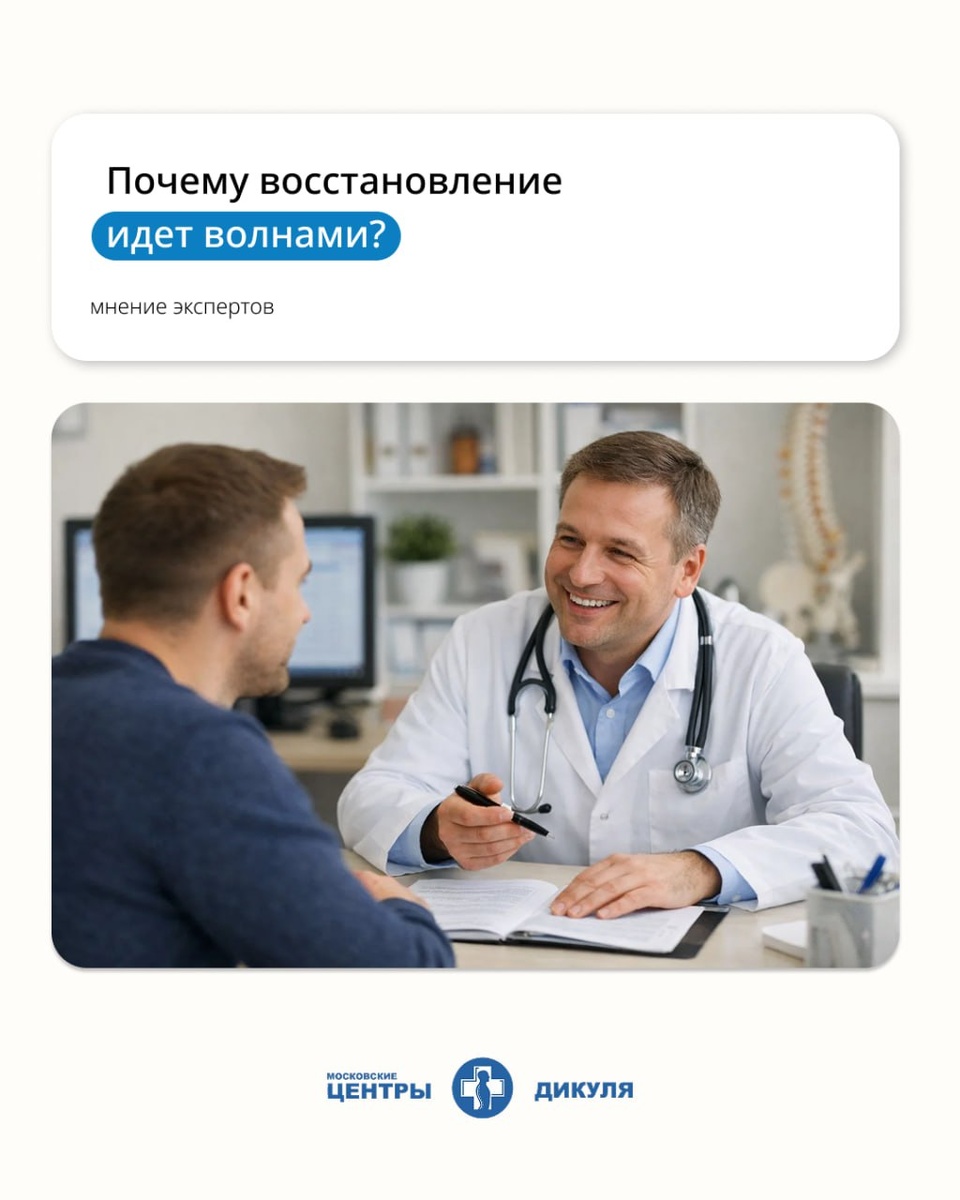 Если вам кажется, что сегодня лучше, а завтра снова хуже — это нормальная часть восстановления. Почему так происходит: • тело адаптируется к нагрузке • мышцы и нервная система перестраиваются • реакция на лечение может быть отсроченной Важно смотреть не на один день, а на общую динамику: 💠периоды облегчения становятся длиннее 💠обострения — слабее 💠движение даётся легче Если восстановление идёт волнами — это не значит, что лечение не работает. Записаться на прием: — по ссылке: — по единому номеру: +7 (495) 150-07-84 #восстановление #реабилитация #центрыдикуля_полезное