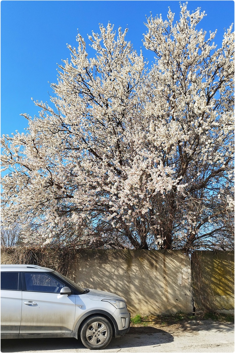 Первые цветущие деревья миндаля я заметил ещё в Супсехе, в окрестностях Анапы, когда гулял там по делам. Дело было примерно 5–6 марта. А потом вспомнил, что в соседнем дворе растёт большое взрослое дерево.