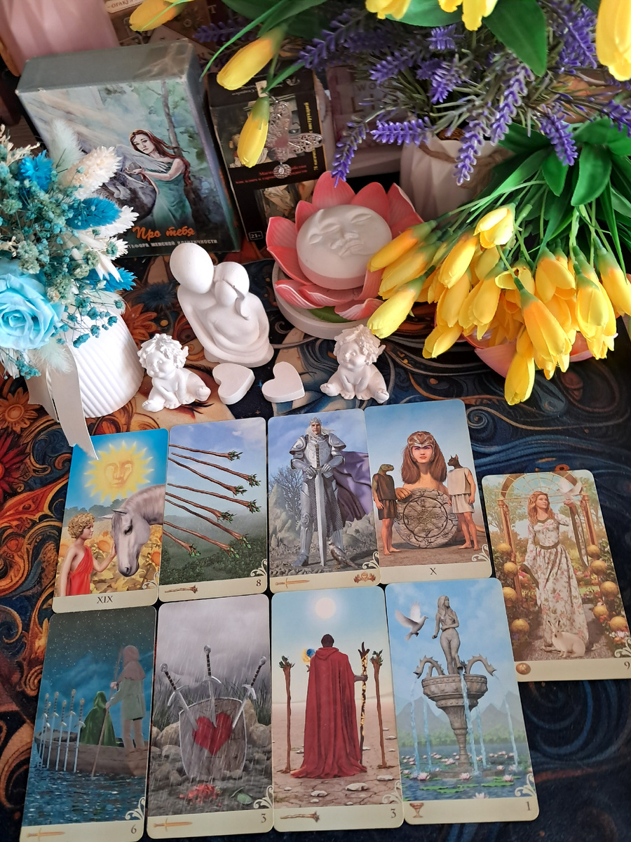 Главный вывод: Вы притягиваете насыщенную, динамичную жизнь, полную эмоций и событий, но ваша душа защищена стеной самодостаточности. Это мудро, но может создавать внутренний конфликт: вы хотите и ярких чувств (Туз Кубков), и одновременно боитесь потерять покой (9 Пентаклей).