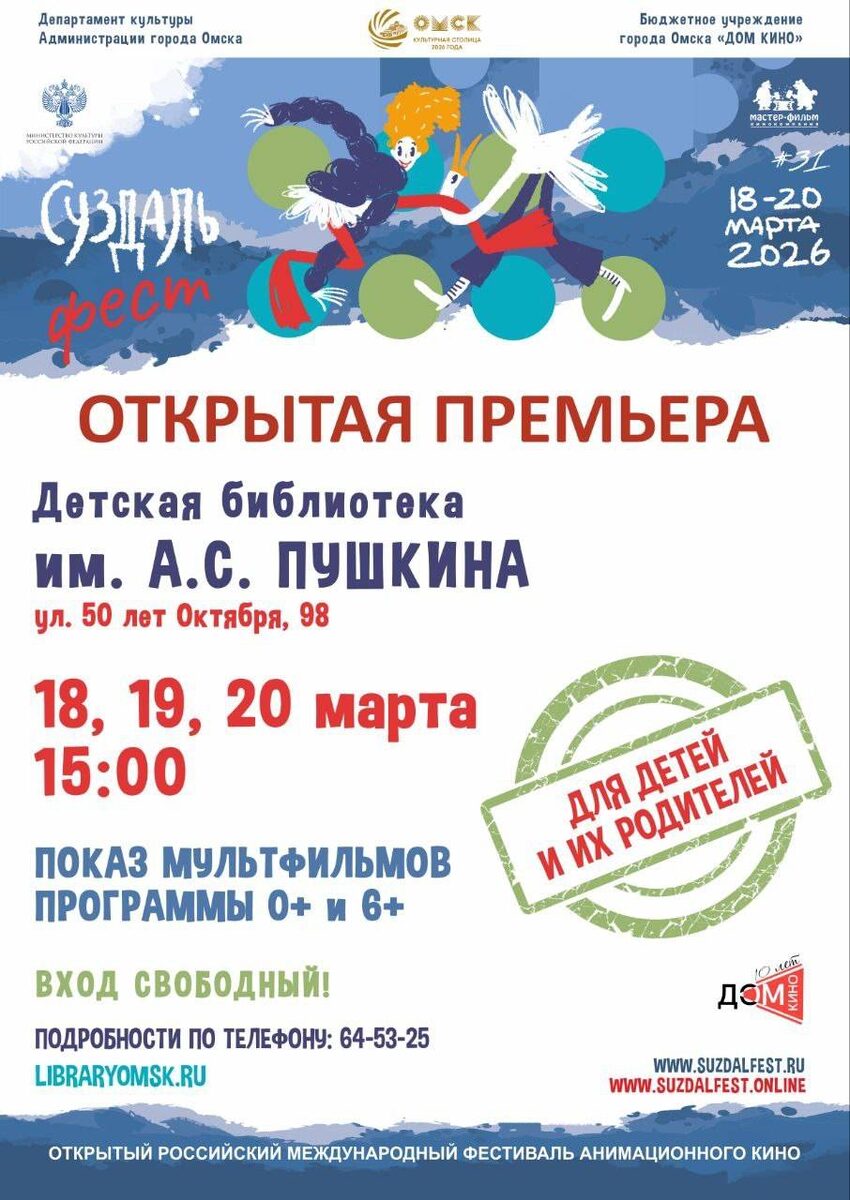 Детская библиотека им. А.С. Пушкина приглашает на показ авторских мультфильмов в рамках всероссийской акции. Участники смогут проголосовать за лучший мультфильм. Начало: 19 марта 2026 15:00 Стоимость: Бесплатно Адрес: г Омск, ул Красный Путь, д 11 Организатор: https://vk.com/public181326340 Внимание, идет мультфильм! Детская библиотека им. А.С. Пушкина стала одной из площадок всероссийской акции "Открытая премьера". Целых три дня в библиотеке можно будет познакомиться с авторскими мультфильмами, созданными для Открытого российского международного фестиваля анимационного кино «Суздальфест». А ещё поделиться своим мнением: принять участие в зрительском голосовании и выбрать лучший мультфильм. 👉 18, 19, 20 марта в 15:00 👉 Вход свободный! Ждём вас! #зрелищные_искусства_просмотр_мультфильма Узнать подробности, адрес или записаться на событие.