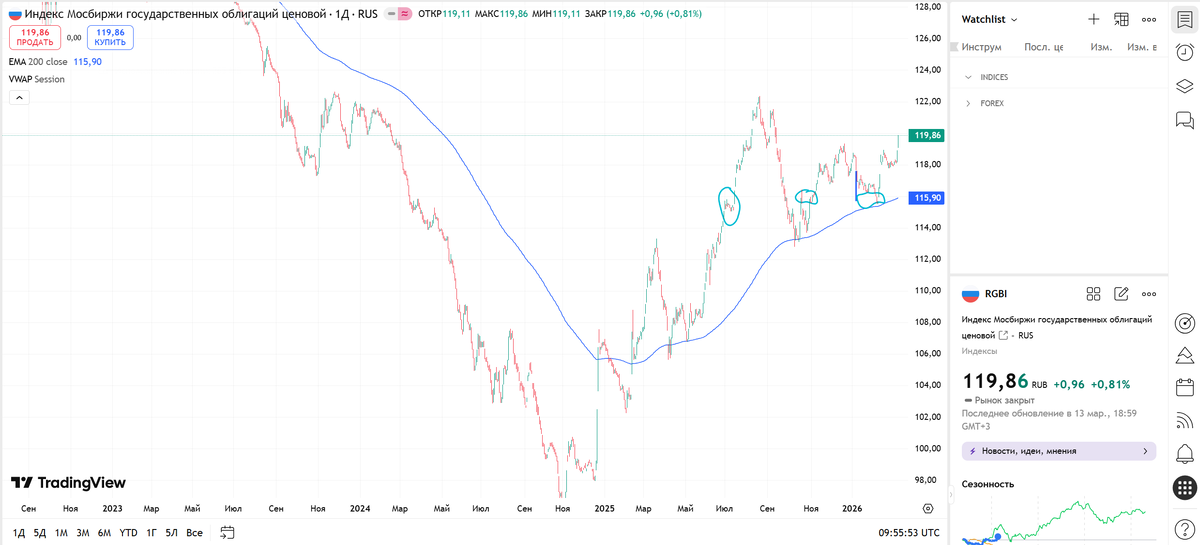Вывод: Цифра 119 означает, что мы находимся в зоне "жесткой политики ЦБ". Облигации стоят дешево, а их доходность (которую индекс не рисует, но мы-то о ней знаем) очень высокая.