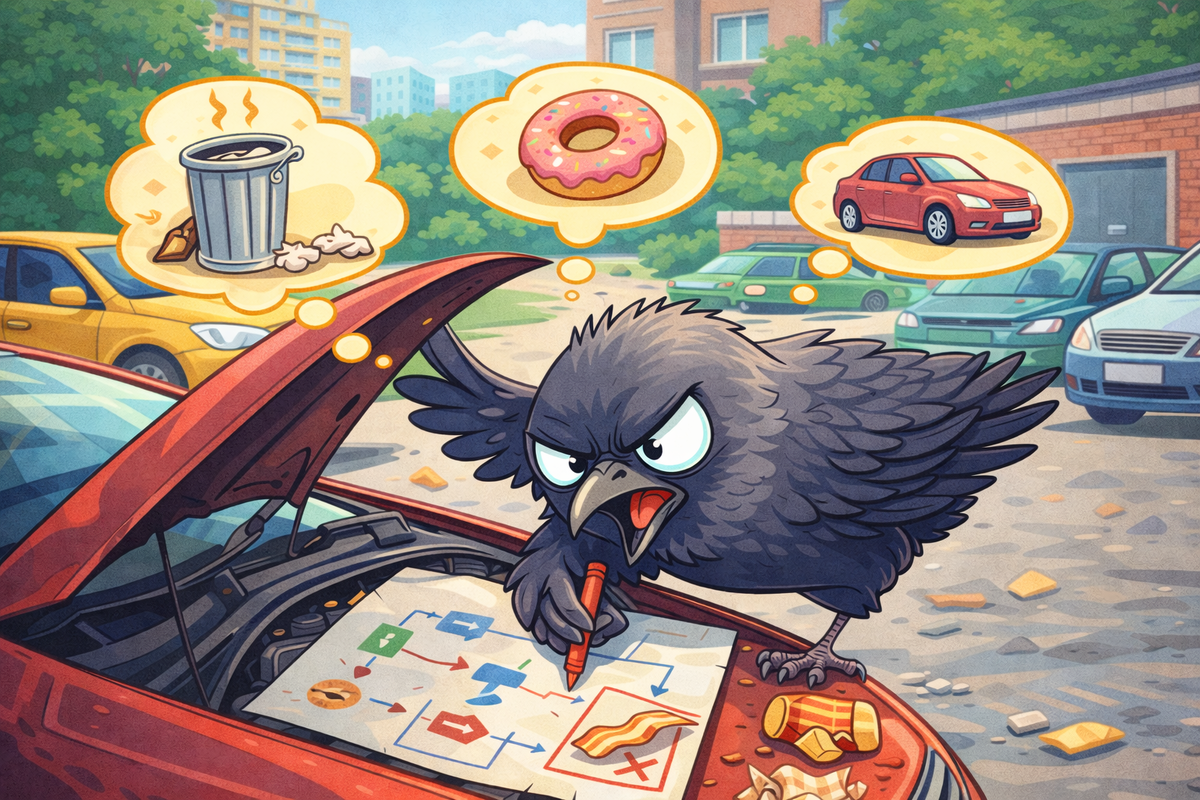 В прошлой статье я рассказал странную историю: как нашёл под капотом машины кусок сала, выкинул его, а на следующий день увидел галку, которая явно пришла за своей заначкой и была крайне недовольна пропажей. Если пропустили ту историю — вот она: https://dzen.ru/a/abQt0AATVxI40hD2 Тогда я шутливо написал, что случайно сломал чей-то бизнес-процесс. Но чем больше я думал об этой ситуации, тем больше понимал: она отлично иллюстрирует одну важную вещь из системного анализа — нефункциональные требования. И галка, судя по всему, подошла к их проектированию довольно серьёзно. Попробуем посмотреть на ситуацию глазами птицы. У неё есть ресурс — кусок сала. Нужно решить задачу: где его безопасно сохранить, чтобы потом вернуться и съесть. Это классическая задача проектирования системы хранения. И галка, похоже, выбрала архитектуру примерно такую: Хранилище: ниша у основания лобового стекла автомобиля (жабо). Контейнер: автомобиль как физическая оболочка. Доступ: сверху, через щель у стекла. На пер