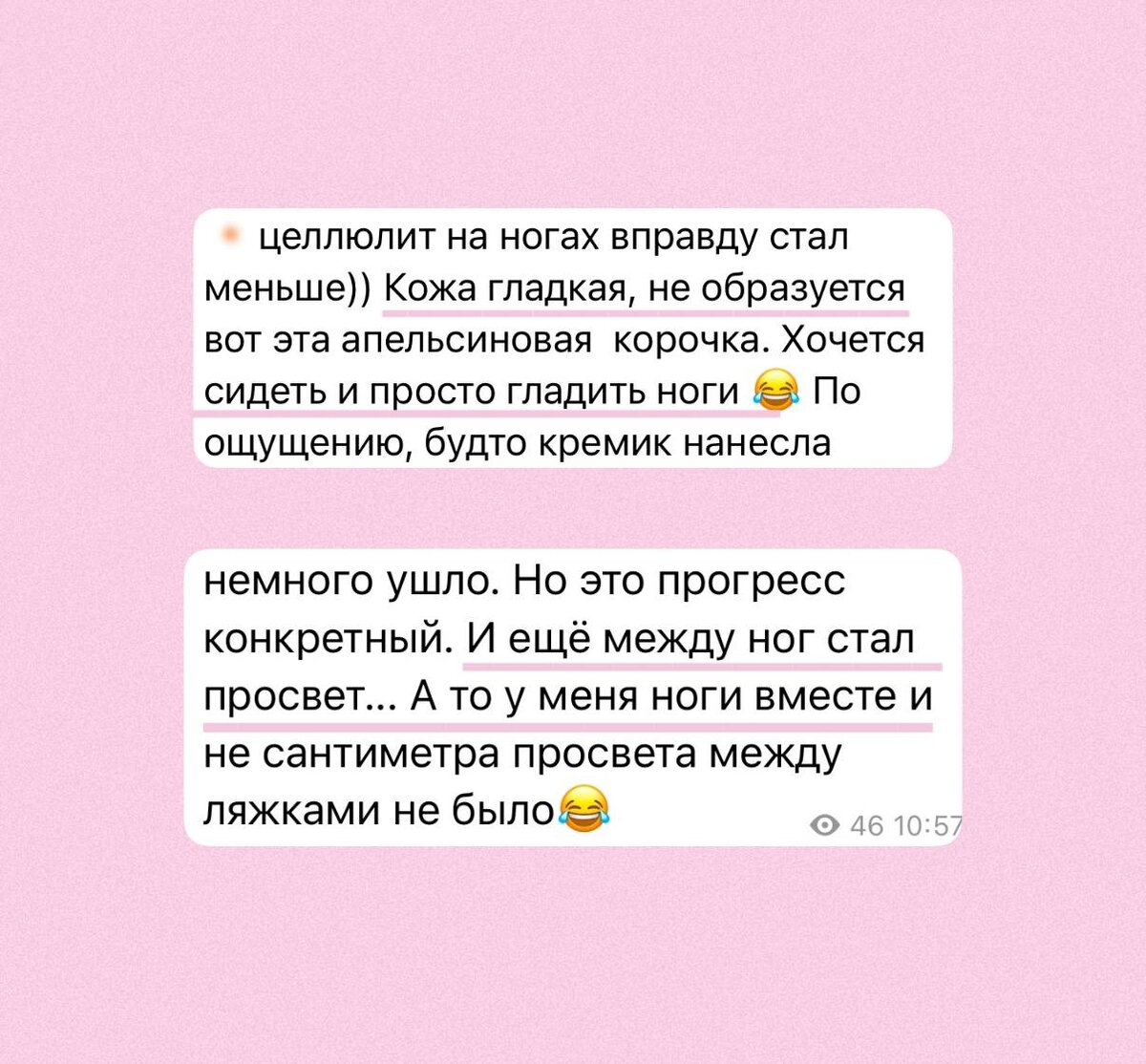 «кожа гладкая, не образуется вот эта апельсиновая корочка…хочется сидеть и просто гладить ноги»