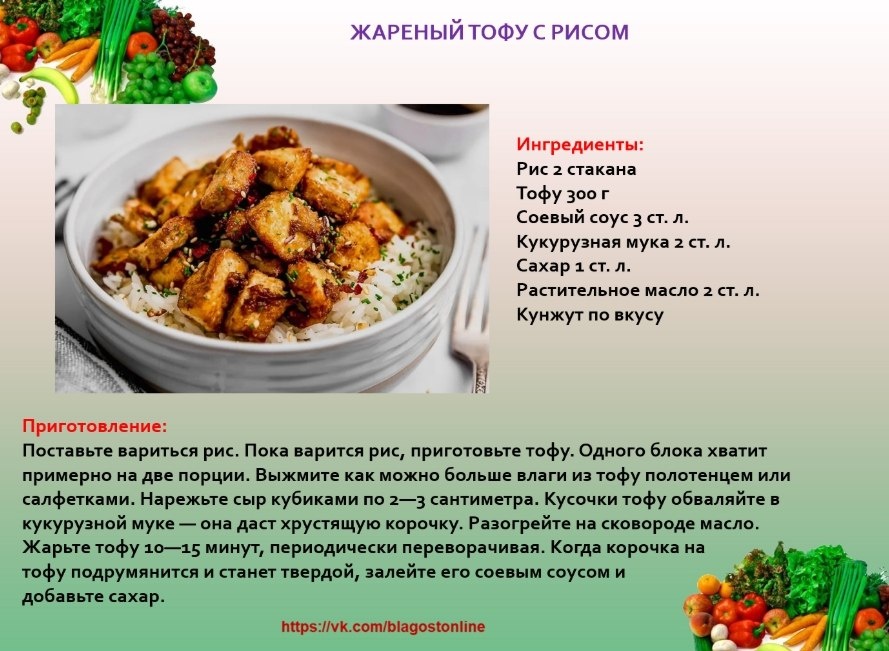 🌀 Ингредиенты: Рис 2 стакана Тофу 300 г Соевый соус 3 ст. л. Кукурузная мука 2 ст. л. Сахар 1 ст. л. Растительное масло 2 ст. л. Кунжут по вкусу 🌀 Приготовление: Поставьте вариться рис. Пока варится рис, приготовьте тофу. Одного блока хватит примерно на две порции. Выжмите как можно больше влаги из тофу полотенцем или салфетками. Нарежьте сыр кубиками по 2—3 сантиметра. Кусочки тофу обваляйте в кукурузной муке — она даст хрустящую корочку. Разогрейте на сковороде масло. Жарьте тофу 10—15 минут, периодически переворачивая. Когда корочка на тофу подрумянится и станет твердой, залейте его соевым соусом и добавьте сахар. 💬 Мы в мессенджере МАХ
