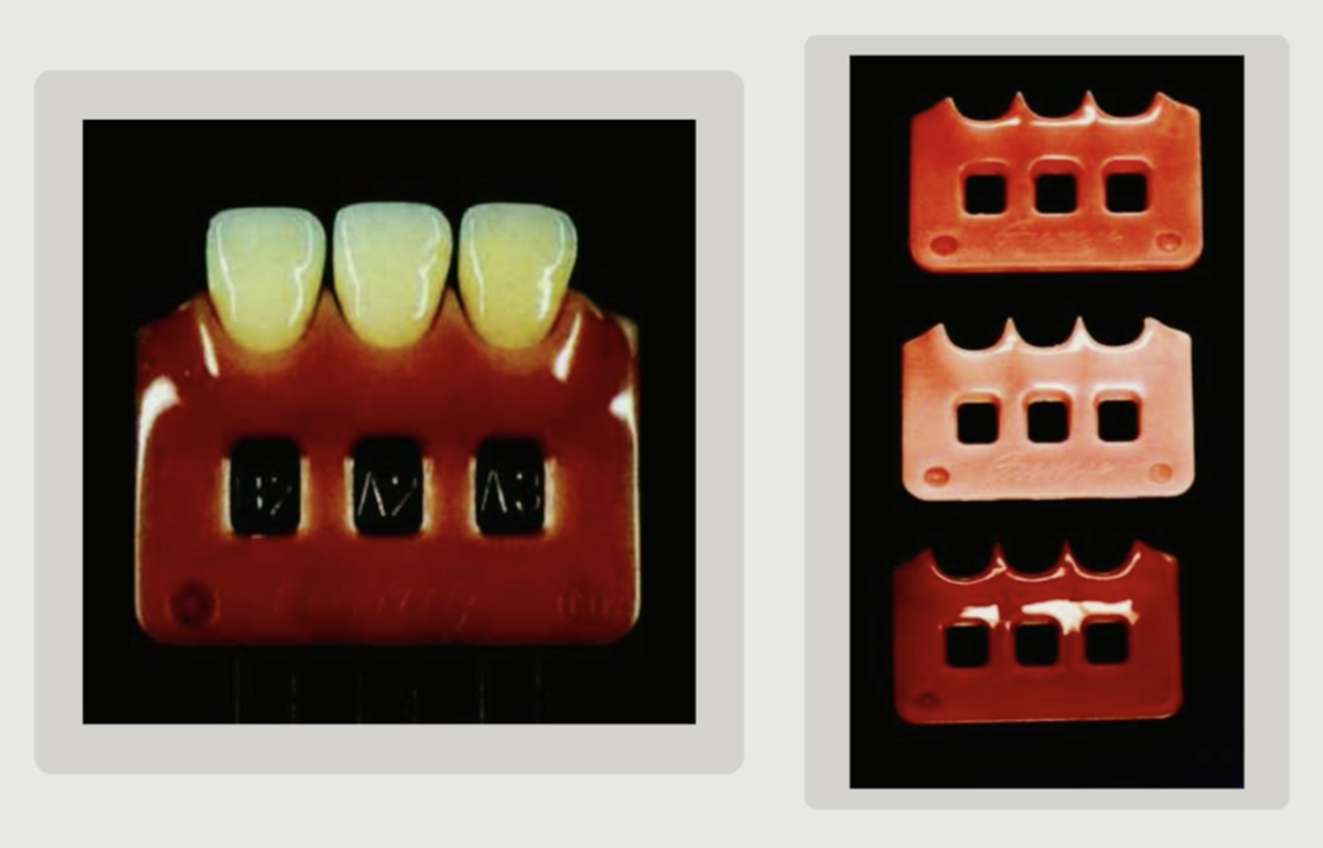 Полезно использовать шкалу оттенков, установленную в подобие десневой маски. Некоторые производители выпускают такие системы готовыми, но их можно сделать и самостоятельно.
