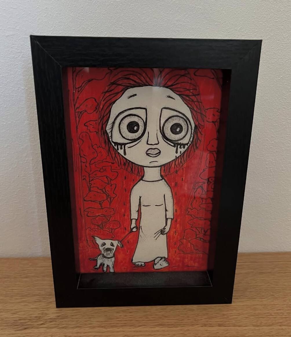 Ну вот у меня купили ещё одну картинку))) Которую рисовала не для продажи, а просто потому что мне понравилось рисовать ручками, понравилось сочетание черного и красного, и просто было одиноко. И не думала, что ее можно продать, но муж сказал, что эту картинку нужно повесить на стену, она ему очень нравится. И она долго висела у нас на стене, пока мы не переехали, и в новом доме гвозди забивать в стены муж не захотел. А потом была небольшая ярмарка, где я выставила все свое творчество, и это в том числе. Ну, раз мужу нравится, то - а вдруг. И заходит семья - папа, мама, их дочь (лет 19) с собачкой. И с такими же сжатыми губками, и красивыми глазами. И папа, увидев мою картинку, посмотрел на свою дочь, и сказал, что это она))) Вот такие странности происходят в жизни. Странности и приятности. После этого муж мне снова твердит, что то, что я творю - оригинально, и не просто каляки-маляки. Но я все еще не определилась, что мне нужно делать в жизни (тетка под 50, еще не нашла свое предназна